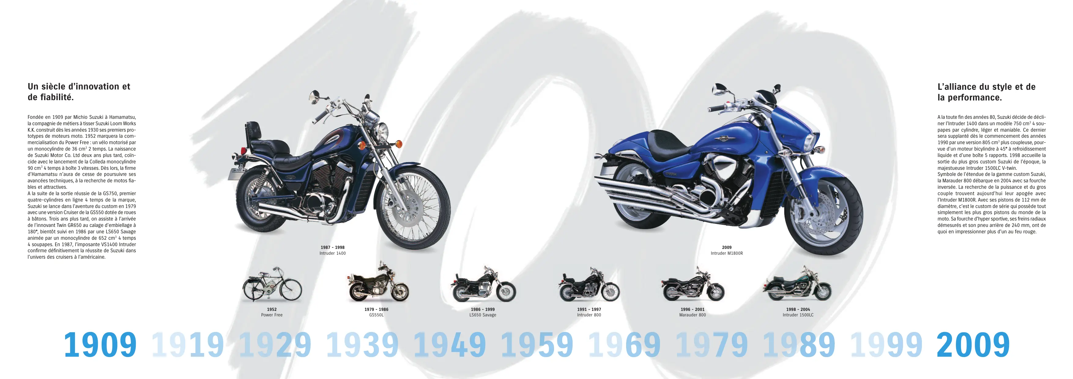 Un siècle d’innovation et de fiabilité. L’alliance du style et de la performance. Fondée en 1909 par Michio Suzuki à Hamamatsu, la compagnie de métiers à tisser Suzuki Loom Works K.K. construit dès les années 1930 ses premiers prototypes de moteurs moto. 1952 marquera la commercialisation du Power Free : un vélo motorisé par un monocylindre de 36 cm3 2 temps. La naissance de Suzuki Motor Co. Ltd deux ans plus tard, coïncide avec le lancement de la Colleda monocylindre 90 cm3 4 temps à boîte 3 vitesses. Dès lors, la firme d’Hamamatsu n’aura de cesse de poursuivre ses avancées techniques, à la recherche de motos fiables et attractives. A la suite de la sortie réussie de la GS750, premier quatre-cylindres en ligne 4 temps de la marque, Suzuki se lance dans l’aventure du custom en 1979 avec une version Cruiser de la GS550 dotée de roues à bâtons. Trois ans plus tard, on assiste à l’arrivée de l’innovant Twin GR650 au calage d’embiellage à 180°, bientôt suivi en 1986 par une LS650 Savage animée par un monocylindre de 652 cm3 4 temps 4 soupapes. En 1987, l’imposante VS1400 Intruder confirme définitivement la réussite de Suzuki dans l’univers des cruisers à l’américaine. A la toute fin des années 80, Suzuki décide de décliner l’Intruder 1400 dans un modèle 750 cm3 4 soupapes par cylindre, léger et maniable. Ce dernier sera supplanté dès le commencement des années 1990 par une version 805 cm3 plus coupleuse, pourvue d’un moteur bicylindre à 45° à refroidissement liquide et d’une boîte 5 rapports. 1998 accueille la sortie du plus gros custom Suzuki de l’époque, la majestueuse Intruder 1500LC V-twin. Symbole de l’étendue de la gamme custom Suzuki, la Marauder 800 débarque en 2004 avec sa fourche inversée. La recherche de la puissance et du gros couple trouvent aujourd’hui leur apogée avec l’Intruder M1800R. Avec ses pistons de 112 mm de diamètre, c’est le custom de série qui possède tout simplement les plus gros pistons du monde de la moto. Sa fourche d'hyper sportive, ses freins radiaux démesurés et son pneu arrière de 240 mm, ont de quoi en impressionner plus d'un au feu rouge. 1987 - 1998 Intruder 1400