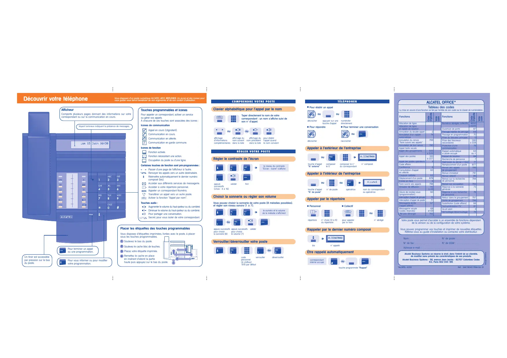 Clavier alphabétique pour l’appel par le nom Votre code Vous disposez d’un poste numérique ALCATEL 4011 REFLEXES. Un écran et des icones pour vous guider vous feront bénéficier de son ergonomie et de son confort d’utilisation. Code implicite Découvrir votre téléphone