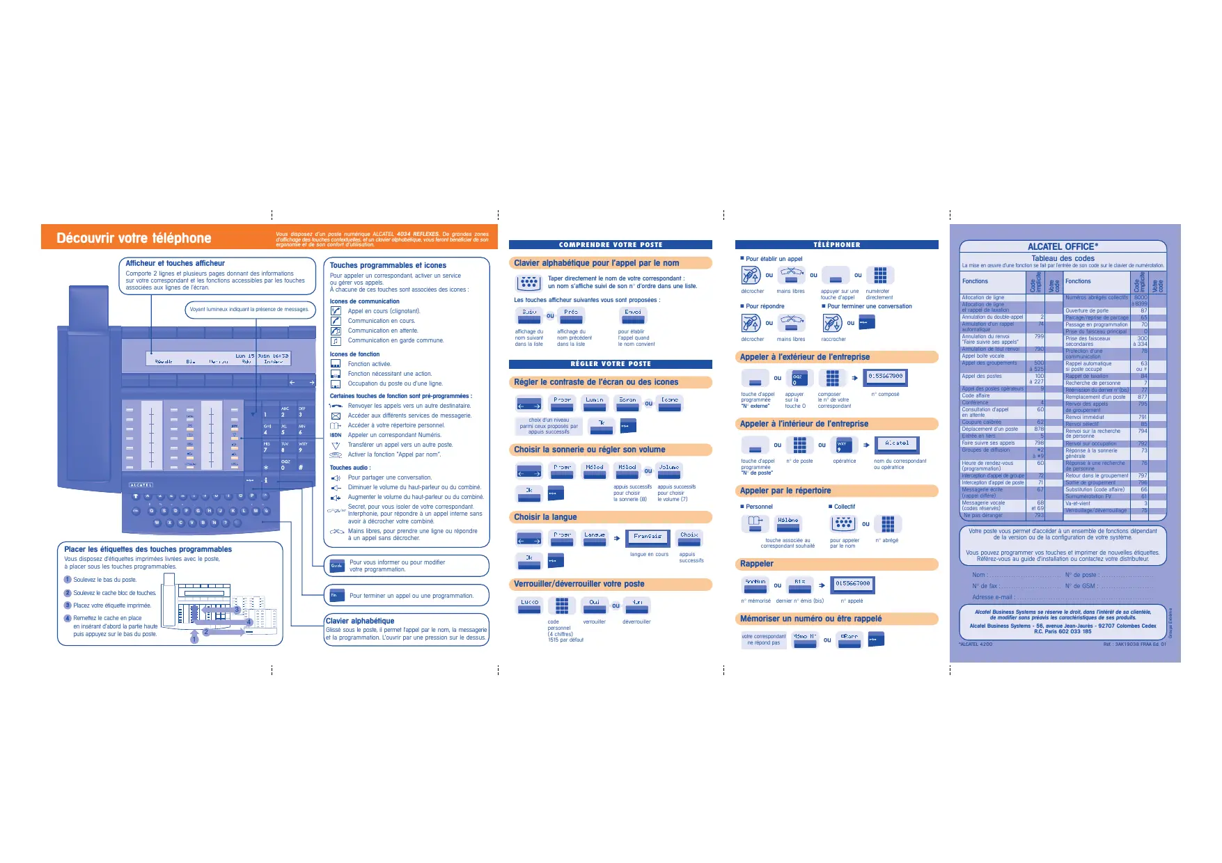 Clavier alphabétique pour l’appel par le nom Votre code Afficheur et touches afficheur Code implicite Vous disposez d’un poste numérique ALCATEL 4034 REFLEXES. De grandes zones d’affichage des touches contextuelles, et un clavier alphabétique, vous feront bénéficier de son ergonomie et de son confort d’utilisation. Découvrir votre téléphone