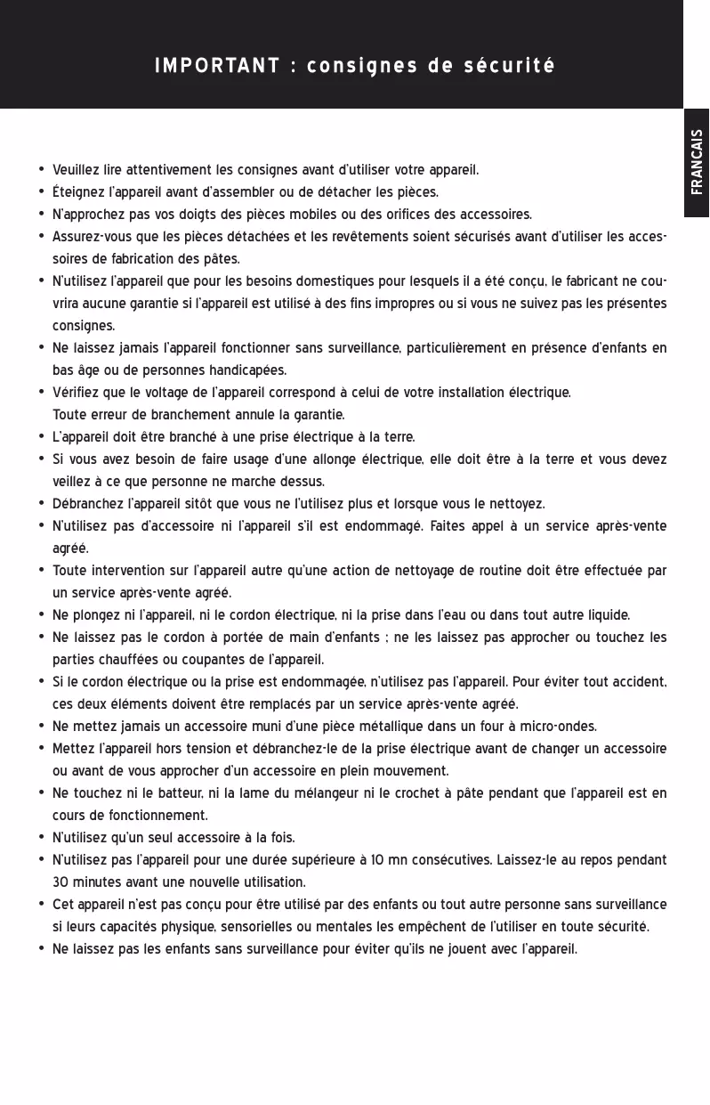 Veuillez lire attentivement les consignes avant d’utiliser votre appareil. Éteignez l’appareil avant d’assembler ou de détacher les pièces. N’approchez pas vos doigts des pièces mobiles ou des orifices des accessoires. Assurez-vous que les pièces détachées et les revêtements soient sécurisés avant d’utiliser les accessoires de fabrication des pâtes. N’utilisez l’appareil que pour les besoins domestiques pour lesquels il a été conçu, le fabricant ne couvrira aucune garantie si l’appareil est utilisé à des fins impropres ou si vous ne suivez pas les présentes consignes. Ne laissez jamais l’appareil fonctionner sans surveillance, particulièrement en présence d’enfants en bas âge ou de personnes handicapées. Vérifiez que le voltage de l’appareil correspond à celui de votre installation électrique. Toute erreur de branchement annule la garantie. L’appareil doit être branché à une prise électrique à la terre. Si vous avez besoin de faire usage d’une allonge électrique, elle doit être à la terre et vous devez veillez à ce que personne ne marche dessus. Débranchez l’appareil sitôt que vous ne l’utilisez plus et lorsque vous le nettoyez. N’utilisez pas d’accessoire ni l’appareil s’il est endommagé. Faites appel à un service après-vente agréé. Toute intervention sur l’appareil autre qu’une action de nettoyage de routine doit être effectuée par un service après-vente agréé. Ne plongez ni l’appareil, ni le cordon électrique, ni la prise dans l’eau ou dans tout autre liquide. Ne laissez pas le cordon à portée de main d’enfants ; ne les laissez pas approcher ou touchez les parties chauffées ou coupantes de l’appareil. Si le cordon électrique ou la prise est endommagée, n’utilisez pas l’appareil. Pour éviter tout accident, ces deux éléments doivent être remplacés par un service après-vente agréé. Ne mettez jamais un accessoire muni d’une pièce métallique dans un four à micro-ondes. Mettez l’appareil hors tension et débranchez-le de la prise électrique avant de changer un accessoire ou avant de vous approcher d’un accessoire en plein mouvement. Ne touchez ni le batteur, ni la lame du mélangeur ni le crochet à pâte pendant que l’appareil est en cours de fonctionnement. N’utilisez qu’un seul accessoire à la fois. N’utilisez pas l’appareil pour une durée supérieure à 10 mn consécutives. Laissez-le au repos pendant 30 minutes avant une nouvelle utilisation. Cet appareil n’est pas conçu pour être utilisé par des enfants ou tout autre personne sans surveillance si leurs capacités physique, sensorielles ou mentales les empêchent de l’utiliser en toute sécurité. Ne laissez pas les enfants sans surveillance pour éviter qu’ils ne jouent avec l’appareil. FRANCAIS I M P O RTA N T : c o ns igne s d e s é c uri t é La séc u rit é d u b at te u r s u r s o cl e Votre sécurité est très importante, au même titre que celle d’autrui. Nous avons affiché plusieurs messages de sécurité importants dans ce manuel ainsi que sur votre robot sur socle. Lisez-les attentivement et respectez-les systématiquement. Ce symbole est synonyme d’avertissement. Il attire votre attention sur les risques potentiels susceptibles de provoquer des blessures mortelles ou graves à l’utilisateur ou d’autres personnes présentes. Tous les messages de sécurité sont imprimés en regards du symbole d’avertissement ou après les mots “DANGER” ou “AVERTISSEMENT”. Ces mots signifient : DANGER AVERTISSEMENT Vous risquez d’être blessé mortellement ou gravement si vous ne respectez pas immédiatement les instructions. Vous risquez d’être blessé mortellement ou gravement si vous ne respectez pas les instructions. Tous les messages de sécurité vous indiquent en quoi consiste le danger potentiel, comment réduire le risque de blessure et ce qui peut arriver si vous ne respectez pas les instructions. Alimentation Votre batteur sur socle fonctionne sur le courant domestique 220-240 volts c.a., 50/60 Hz. La puissance nominale de notre batteur sur socle est imprimée sur la bande de garniture. Cette puissance est déterminée en utilisant l’accessoire consommant le plus de puissance. D’autres accessoires recommandés peuvent consommer bien moins de puissance. N’utilisez pas de rallonge électrique. Si le cordon d’alimentation est trop court, faites installer une prise de courant près de l’appareil par un électricien ou un technicien qualifié. AVERTISSEMENT Risque d’électrocution Branchez l’appareil dans une prise reliée à la terre. Ne démontez pas la prise de terre. N’utilisez pas d’adaptateur. N’utilisez pas de rallonge électrique. Le non-respect de ces instructions peut entraîner des blessures mortelles, un incendie ou une électrocution. FRANCAIS Ut i lis at io n d e vo tre ro b o t Description