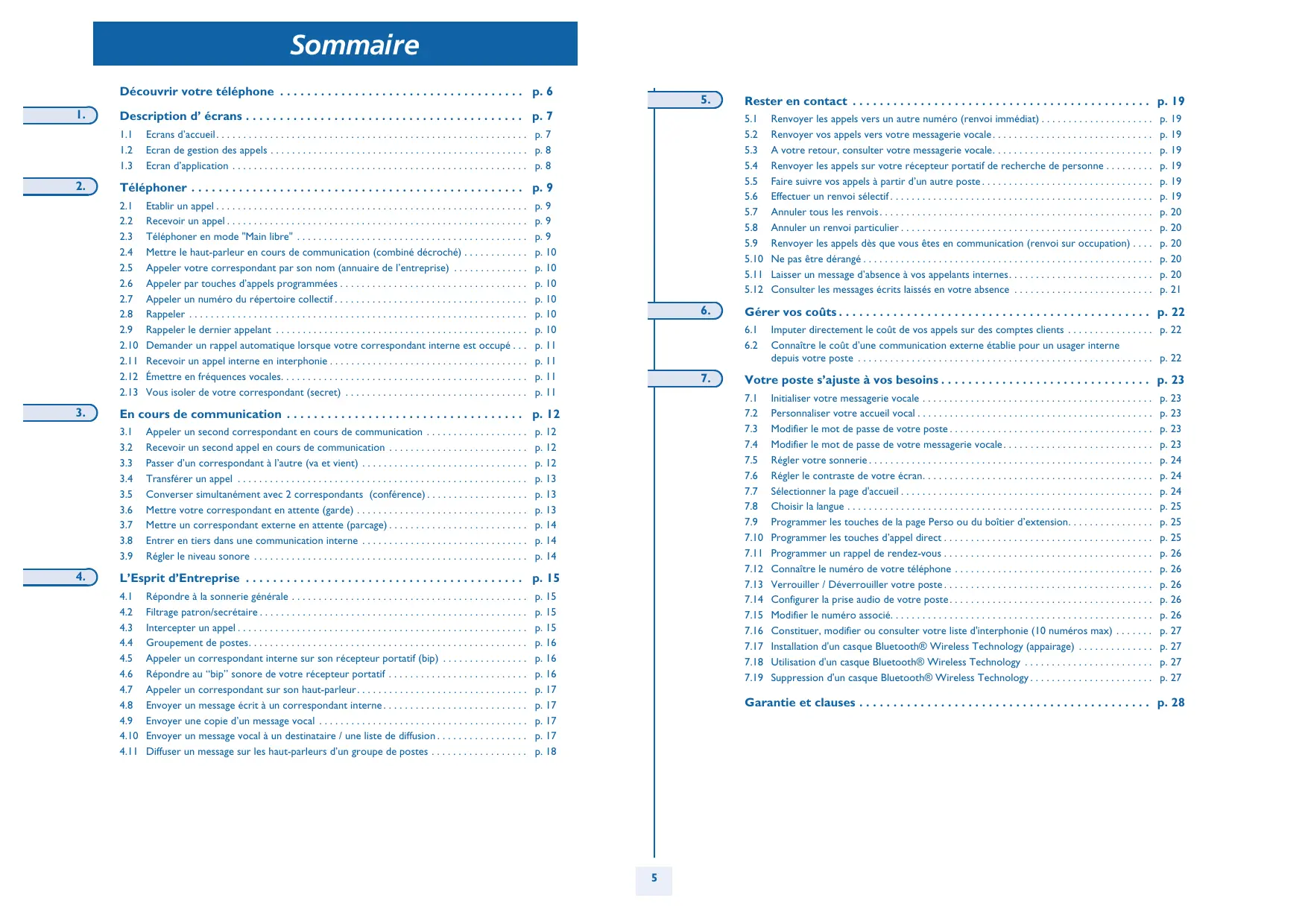 Garantie et clauses howtoc Déclaration de conformité CE : nous, Alcatel Business Systems, déclarons que le produit Alcatel 4038/4039/4068 est présumé conforme aux exigences essentielles de la Directive 1999/5/CE du Parlement Européen et du Conseil. Une copie de l'original de cette déclaration de conformité peut être obtenue par l'intermédiaire de votre installateur. Indépendamment de la garantie légale dont il bénéficie, cet appareil est garanti un an, pièces et main-d’œuvre, à compter de la date figurant sur votre facture. La présentation de la facture sera exigée lorsque la garantie sera invoquée. Toutefois, cette garantie ne s’applique pas : en cas d’utilisation non conforme aux instructions figurant dans ce manuel utilisateur, de défauts ou détériorations provoqués par l'usure naturelle, de détériorations provenant d’une cause extérieure à l’appareil (ex : choc, chute, exposition à une source d'humidité, etc.), d’une installation non conforme ou de modifications ou de réparations réalisées par des personnes non agréées par le fabricant ou le revendeur. Alcatel 4068 Cet appareil utilise un spectre de fréquences radio dont l'utilisation n'est pas harmonisée dans l'ensemble des pays de la CE . Le spectre de fréquences peut être partagé par d'autres applications et son utilisation est soumise aux deux conditions suivantes : (1) cet appareil ne doit pas provoquer d'interférences nuisibles, (2) cet appareil doit accepter toute interférence reçue, y compris les interférences pouvant entraîner un fonctionnement non souhaité. Cet appareil est conforme à la section 15 des règlements de la FCC (Federal Communications Commission). Cet appareil a été conçu et fabriqué de façon à ne pas excéder les limitations d'émission d'énergie de fréquence radio en SAR (Specific Absorption Rate) établies par les différents pays concernés (FCC pour les Etats-Unis). Alcatel Business Systems se réserve le droit, dans l’intérêt de sa clientèle, de modifier sans préavis les caractéristiques de ses produits. Copyright© Alcatel Business Systems 2005. Tous droits réservés. Attention, ne mettez jamais votre poste téléphonique en contact avec l'eau. Toutefois, pour nettoyer votre poste, vous pouvez utiliser un chiffon doux légèrement humidifié. N'utilisez jamais de solvants (trichloréthylène, acétone, etc.) qui risquent d'endommager les surfaces plastiques de votre poste. Ne jamais vaporiser de produits nettoyants. L'écouteur du combiné peut attirer des objets métalliques pouvant être dangereux pour l'oreille. Les libellés ne sont pas contractuels et peuvent être soumis à des modifications Certaines fonctions de votre poste dépendent de la configuration du système et de l’activation d’une clé logicielle. MU19001AAAB-E601ed01-0805