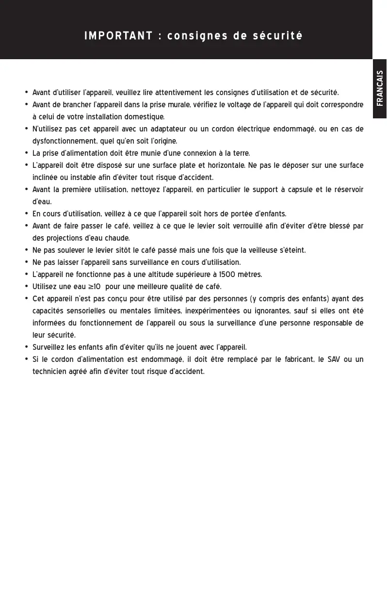 • N’utilisez pas cet appareil avec un adaptateur ou un cordon électrique endommagé, ou en cas de dysfonctionnement, quel qu’en soit l’origine. • La prise d’alimentation doit être munie d’une connexion à la terre. • L’appareil doit être disposé sur une surface plate et horizontale. Ne pas le déposer sur une surface inclinée ou instable afin d’éviter tout risque d’accident. • Avant la première utilisation, nettoyez l’appareil, en particulier le support à capsule et le réservoir d’eau. • En cours d’utilisation, veillez à ce que l’appareil soit hors de portée d’enfants. • Avant de faire passer le café, veillez à ce que le levier soit verrouillé afin d’éviter d’être blessé par des projections d’eau chaude. • Ne pas soulever le levier sitôt le café passé mais une fois que la veilleuse s’éteint. • Ne pas laisser l’appareil sans surveillance en cours d’utilisation. • L’appareil ne fonctionne pas à une altitude supérieure à 1500 mètres. • Utilisez une eau ≥10℃ pour une meilleure qualité de café. • Cet appareil n’est pas conçu pour être utilisé par des personnes (y compris des enfants) ayant des capacités sensorielles ou mentales limitées, inexpérimentées ou ignorantes, sauf si elles ont été informées du fonctionnement de l’appareil ou sous la surveillance d’une personne responsable de leur sécurité. • Surveillez les enfants afin d’éviter qu’ils ne jouent avec l’appareil. • Si le cordon d’alimentation est endommagé, il doit être remplacé par le fabricant, le SAV ou un technicien agréé afin d’éviter tout risque d’accident.
