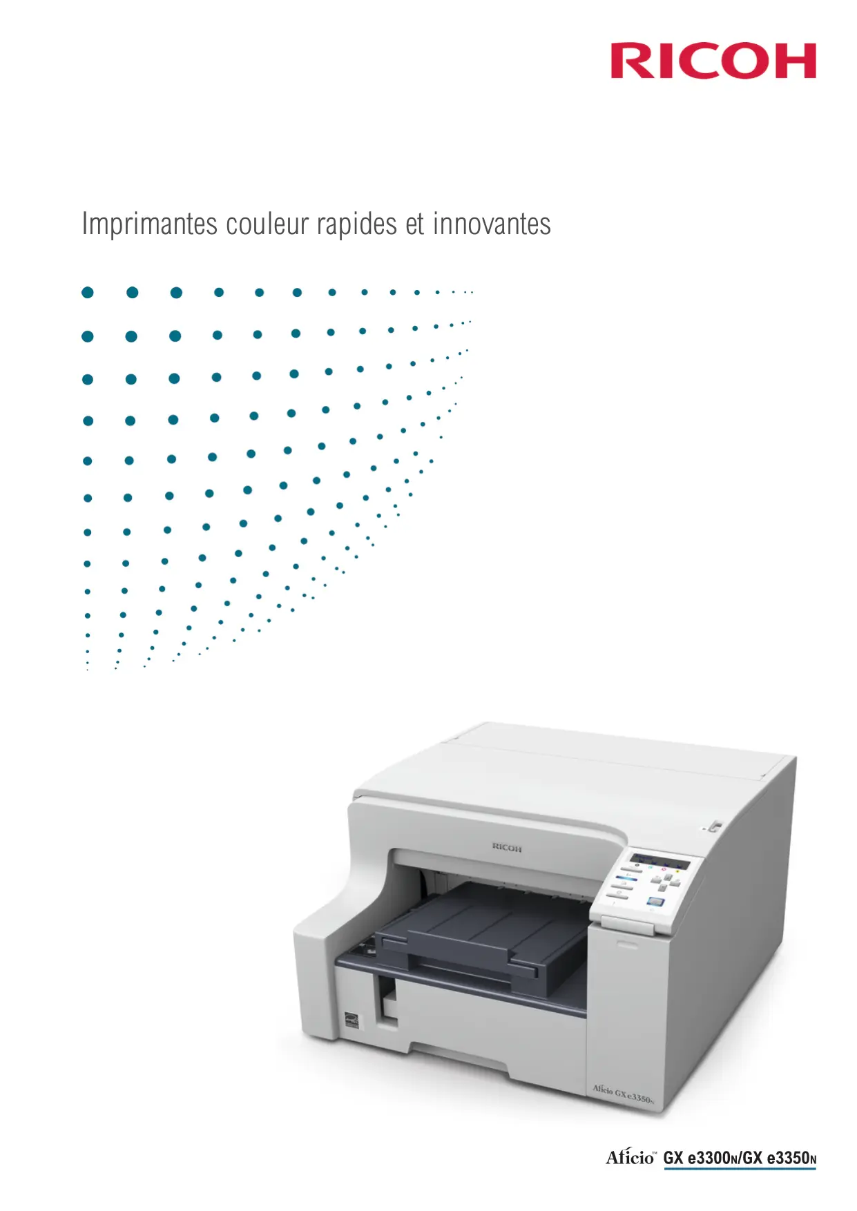Imprimantes couleur rapides et innovantes Choisissez le futur - Technologie GelSprinter™ Les Aficio™GX e3300N et GX e3350N sont des imprimantes couleur ultra-performantes destinées aux petites entreprises et aux bureaux personnels. Elles conviennent parfaitement à l’utilisation individuelle professionnelle ou aux réseaux des petits groupes de travail. Ces imprimantes s'appuient sur la technologie GelSprinter™ unique de Ricoh qui connaît déjà un grand succès. Les faibles émissions de carbone et la consommation électrique réduite comptent parmi leurs nombreuses caractéristiques en ligne avec le respect de l’environnement. Vitesse d’impression jusqu’à 29 ppm. Haute qualité d’image sur papier ordinaire. Faible coût total de possession (TCO). Capacité réseau. Un coût de la couleur ÉCOnomique proche du N&B. GelSprinter™ : Respect de l’environnement, rentabilité et convivialité BÉNÉFICIEZ DE LA TECHNOLOGIE GEL La technologie GelSprinter™ présente des avantages significatifs par rapport aux systèmes traditionnels. Les GX e3300N et GX e3350N fonctionnent avec les nouvelles cartouches Liquid Gel™ Ricoh. Le gel à séchage rapide vous assure une productivité élevée, ainsi que des images nettes aux couleurs vives. Il s’agit de solutions rapides et abordables pour votre flux de travail couleur. LA PLEINE COULEUR À L'ÈRE DU GREEN Les produits Ricoh sont conçus pour avoir un impact minime au cours de leur cycle de vie. Les GX e3300N et GX e3350N constituent de nouveaux points de référence en matière de respect de l’environnement. La consommation énergétique est réduite au strict minimum. Le fonctionnement est propre et silencieux ; les GelSprinters™ n’émettent pas de poussière. Pour vous aider à économiser du papier, l’unité Recto/Verso est livrée en standard.