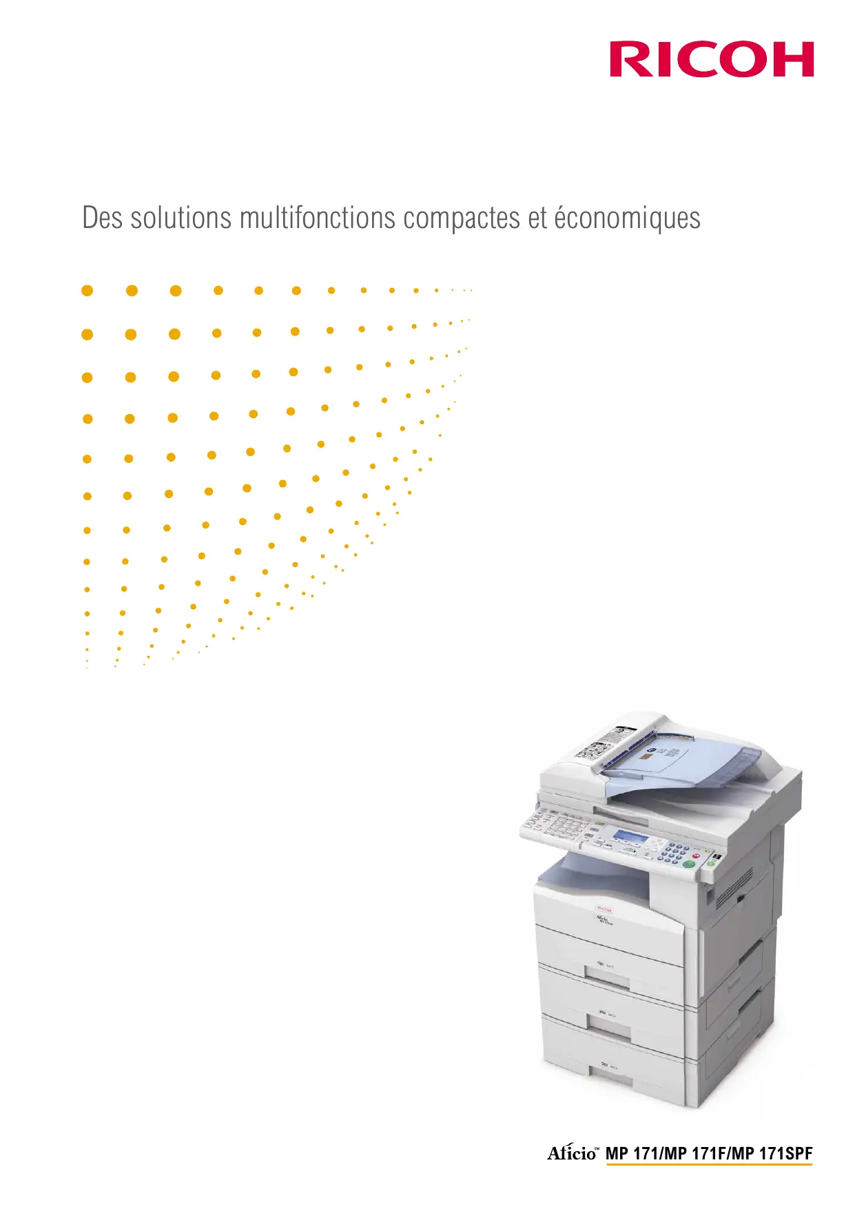 MP 171/MP 171F/MP 171SPF Des fonctionnalités complètes adaptées à votre environnement bureautique Fonctionnement sans incidents, sécurité, rentabilité… Telles sont les caractéristiques que vous attendez d’une solution bureautique. Les Aficio™MP 171/MP 171F/MP 171SPF sont faits pour vous. Compacts mais rapides, ces appareils multifonctions A4 ont une puissance étonnante pour leur taille. Ils offrent une large gamme de fonctions à un coût total de possession très attractif. Le MP 171SPF peut en outre être personnalisé avec notre Kit de développement logiciel : un atout supplémentaire pour votre parc existant.