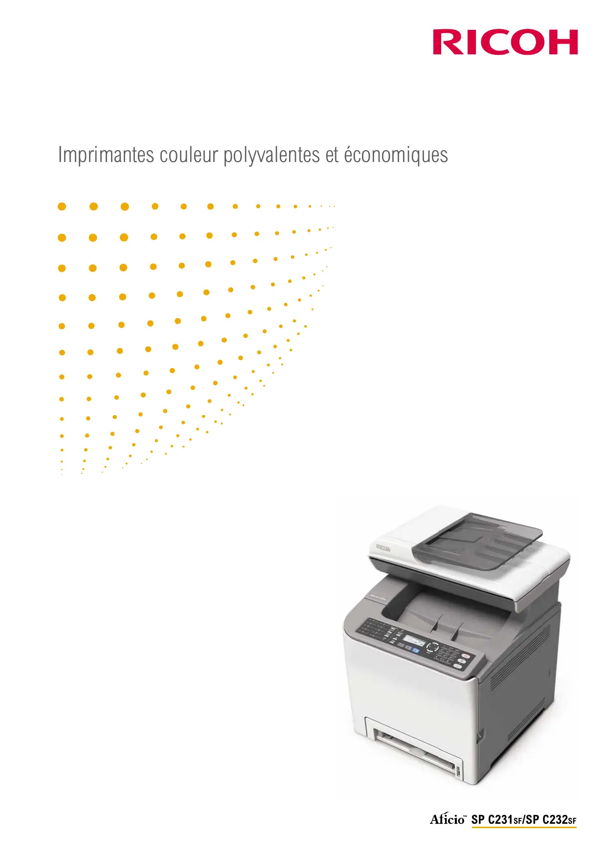 Imprimantes couleur polyvalentes et économiques SP C231SF/SP C232SF Le compagnon bureautique idéal La gestion d’une petite entreprise représente de nombreux défis, nous en sommes conscients. Les Aficio™SP C231SF et SP C232SF de Ricoh ont été spécialement conçues pour répondre à tous vos besoins. Elles sont compactes mais comportent de nombreuses fonctionnalités, de la production de documents couleur à la distribution numérique, en passant par des fonctions de sécurité. Elles réussissent à associer vitesse et haute qualité d’image avec un coût total de possession très attractif. Prix unitaire intéressant, unité recto verso en standard : découvrez deux imprimantes compactes ultra puissantes !