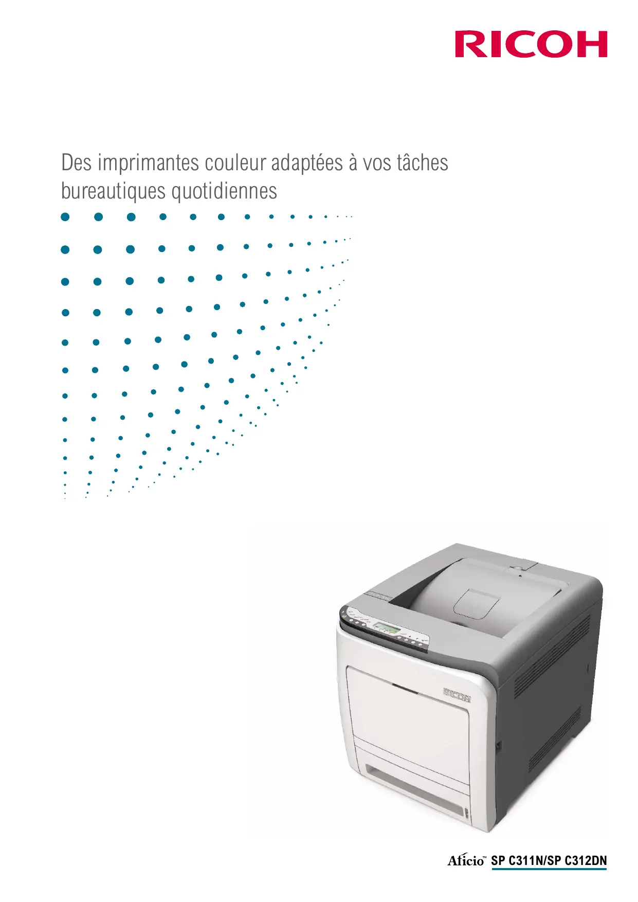 Des imprimantes couleur adaptées à vos tâches bureautiques quotidiennes SP C311N/SP C312DN Une excellente qualité, pour un coût limité C’est un fait : les documents couleurs ont plus d’impact que les documents en noir et blanc. Les Aficio™ SP C311N/SP C312DN de Ricoh permettent d’obtenir cette valeur ajoutée à un coût par page très attractif. Ils bénéficient en effet d’un temps de préchauffage court, d’une vitesse d’impression élevée et d’une qualité d’image exceptionnelle. Donnez à vos documents internes la qualité qui fera la différence, grâce aux fonctions d’impression des Aficio SP C311N/SP C312DN. Ces systèmes sont simples à utiliser et sont conçus pour répondre aux besoins de vos flux de travaux couleur.