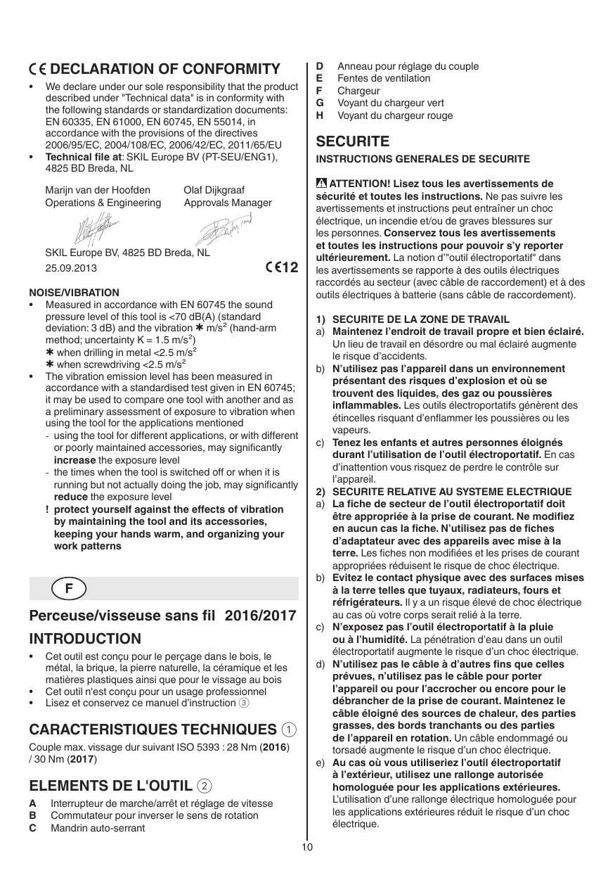 Contrôlez toujours si la tension secteur correspond à la tension indiquée sur la plaquette signalétique du chargeur En cas d’anomalie électrique ou mécanique, coupez immédiatement l’outil ou débranchez le chargeur du secteur SKIL ne peut se porter garant du bon fonctionnement de cet outil que s’il a été utilisé avec les accessoires d’origine La vitesse admissible des accessoires utilisées doit être au moins aussi élevée que la vitesse à vide maximale de l’outil L'outil/chargeur n'a pas été conçu pour être utilisé par des personnes (y compris des enfants) dont les capacités physiques, sensorielles ou mentales sont réduites, ou manquant d'expérience ou de connaissances, excepté si elles ont fait l'objet d'une surveillance ou ont reçu des instructions concernant l'utilisation de l'outil/chargeur par une personne responsable de leur sécurité Veillez à ce que les enfants ne jouent pas avec l'outil/ le chargeur Fixez solidement la pièce à travailler (une pièce fixée à l'aide de dispositifs de fixation est davantage assurée que si elle était tenue à la main) Tenez l’outil par les surfaces de préhension isolées, lors de la réalisation d’une opération au cours de laquelle l’accessoire de coupe ou la vis peut entrer en contact avec un câblage non apparent ou son propre câble d’alimentation (le contact avec un fil sous tension peut également mettre sous tension les parties métalliques de l’outil électrique et provoquer un choc électrique sur l’opérateur) Utilisez des détecteurs appropriés afin de localiser la présence de conduites électriques ou bien s’adresser à la société locale de distribution (un contact avec des lignes électriques peut provoquer un incendie et une décharge électrique; le fait d’endommager une conduite de gaz peut entraîner une explosion; le fait d’endommager une conduite d’eau peut entraîner des dégâts matériels ou causer une décharge électrique) Ne travaillez pas de matériaux contenant de l’amiante (l’amiante est considérée comme étant cancérigène) La poussière de matériaux, tels que la peinture contenant du plomb, certaines espèces de bois, certains minéraux et différents métaux, peut être nocive (le contact avec la poussière ou son inhalation peut provoquer des réactions allergiques et/ou des maladies respiratoires chez l'opérateur ou des personnes se trouvant à proximité); portez un masque antipoussières et travaillez avec un appareil de dépoussiérage lorsqu’il est possible d’en connecter un Certains types de poussières sont classifiés comme étant cancérigènes (tels que la poussière de chêne ou de hêtre), en particulier en combinaison avec des additifs de traitement du bois; portez un masque antipoussières et travaillez avec un appareil de dépoussiérage lorsqu’il est possible d’en connecter un Suivez les directives nationales relatives au dépoussiérage pour les matériaux à travailler