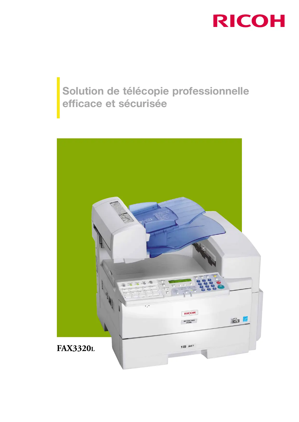 Solution de télécopie professionnelle efficace et sécurisée FAX3320L Un télécopieur haut débit pour les groupes de travail de petite et moyenne taille La télécopie est toujours l’une des formes de transmission de données les plus fiables et les plus utilisées. L’envoi d’une télécopie est très facile, mais le FAX3320L de Ricoh vous propose bien plus, et notamment un haut débit et une accessibilité immédiate. Tout en maximisant votre flux de travaux, le FAX3320L garantit un trafic de télécopies simple et sans incident. En matière de sécurité, le FAX3320L empêche toute utilisation illicite et garantit qu’aucune information ne sera perdue. Grâce à ses performances sans cesse améliorées et une excellente qualité d'impression, l’envoi de télécopies devient une tâche professionnelle et rapidement éxécutée.