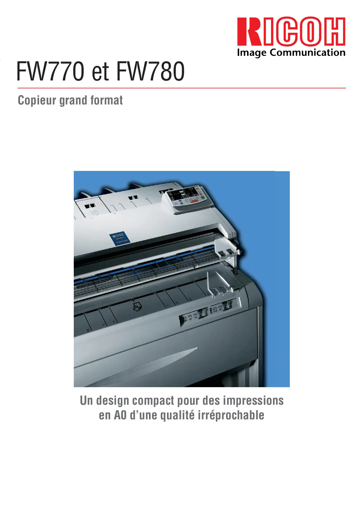FW770 et FW780 Copieur grand format Un design compact pour des impressions en A0 d’une qualité irréprochable Un pas en avant dans la copie grand format Dans votre environnement professionnel, les délais sont serrés et la qualité exigée est de plus en plus élevée. Votre entreprise doit rester à la pointe du traitement des documents. Pour y parvenir, Ricoh présente les nouveaux copieurs FW770 et FW780. Ces copieurs grand format analogiques offrent à la fois la qualité d’impression combinée à la vitesse d’impression, la compacité et une grande simplicité d’utilisation. Conçus pour répondre aux besoins spécifiques de votre groupe de travail, de votre bureau d’études ou de votre centre de reprographie, les FW770 et FW780 permettent d’obtenir des impressions grand format d’une très bonne qualité à un coût réduit. Grâce à leur convivialité, leur design compact et leurs nombreuses fonctions permettant d’économiser temps et de simplifier les manipulations – telles que la copie synchronisée ou la copie multiple –, les FW770 et FW780 sont les copieurs grand format idéaux pour votre entreprise. Les copieurs FW770 et FW780 sont le reflet de l’importance que Ricoh attache à vos conditions de travail et qui transparaît dans leur design, leur utilisation et leur maintenance. FW780 : Le copieur A0 polyvalent Pour répondre à vos besoins d’impression en A0 de plus en plus importants, Ricoh présente le nouveau FW780. Il vous permet d’économiser du temps et de l’argent. Cette nouvelle solution pour la copie grand format est conçue pour améliorer les performances de votre groupe de travail et offrir à votre entreprise des conditions de travail plus sereine. Manipulation optimisée des originaux Production de copies multiples Copier de vieux originaux ou des originaux usés peut parfois s’avérer délicat. Le copieur FW780, leur apporte toute l’attention nécessaire. Les originaux peuvent être introduits manuellement ou automatiquement avec la touche d’alimentation automatique d’original. Ils ne sont jamais endommagés. Les originaux épais, rigides ou présentant des collages peuvent également être introduits par les FW770 et FW780 car ils sont dotés d’une alimentation arrière spécialement conçue pour prévenir toute dégradation. Lorsque vous voulez faire plusieurs tirages à partir d’un même document, insérez-le une seule fois. Grâce à la fonction multicopie du FW780, vous gagnez dorénavant du temps en programmant jusqu’à dix copies. Avec le taux de reproduction 1 : 1 les copies sont au format de l’original. Différents supports papier Les dessins techniques, les perspectives, les plans et les cartes font partie des documents que vous utilisez et que vous copiez quotidiennement. Grâce à ses chargeurs à rouleau(x), le copieur FW780 est conçu pour traiter différents supports papier et pour vous donner l’assurance de les reproduire sans effort. Vous avez la possibilité d’imprimer jusqu’à dix copies par l’avant de la machine grâce au réceptacle copies du FW780. Les originaux épais, rigides ou présentant des collages sont traités par l’alimentation arrière, très pratique, du copieur FW780. La découpe sur mesure Grâce au FW780, les copies sont reproduites et découpées suivant la taille de l’original. Il vous suffit de placer votre original, et la copie aura la taille de l’original grâce à la fonction coupe synchronisée. Plus besoin de réglages ni de découpage manuel. Vos copies sont prêtes sans que vous ayez à intervenir. FW770 : Le copieur A0 adapté à vos exigences Avec la pression due à votre rythme de travail et aux exigences toujours plus pointues de vos clients, votre copieur grand format doit être fiable, compact, polyvalent et d’une utilisation aisée. En associant tous ces éléments essentiels, le nouveau copieur FW770 est conçu pour optimiser votre travail. Un grand nombre d’options ont été spécialement conçues pour vous satisfaire. Une qualité d’impression irréprochable Les clients réclament un travail de qualité. Avec le nouveau copieur FW770, Ricoh offre une excellente qualité de copie grand format sur papier ordinaire. Les demi-tons et les tracés fins sont parfaitement reproduits. Même les copies de vieux originaux décolorés en diazocopie ressortent comme neuves grâce aux 14 niveaux de densité d’image du FW770. A la recherche de l’espace perdu Vous avez besoin d’un copieur grand format, mais l’espace que vous pouvez lui allouer est réduit. Copieur grand format le moins encombrant du marché, compact, le FW770 est conçu pour se loger n’importe où. Alimentation optimisée Traiter et copier nécessite un copieur grand format convivial et simple d’utilisation. Le FW770 a été conçu pour vous simplifier la vie. Grâce à sa grande table d’alimentation des originaux, copier les documents même les plus grands devient simple. Un matériel évolutif Le FW770 s’adapte à la croissance des entreprises. L’addition de chargeurs à rouleau(x), permet une alimentation papier sans interruption et accroît la productivité. Le copieur FW770 est prêt à répondre n’importe quand à la demande croissante de votre entreprise. Découpe ajustable Avec le FW770, réaliser des copies à partir d’originaux dont vous ne connaissez pas la longueur n’est pas un problème. Il suffit de placer l’original et en appuyant simplement sur un bouton, vous choisissez la position de la découpe. Vos copies auront la longueur désirée. Les deux modèles offrent une qualité d’impression irréprochable. Avec le chargeur deux rouleaux en option sur les FW770 et FW780, deux types de papier sont disponibles simultanément. Le A0 en souplesse Qualité d’impression optimale, productivité et souplesse sont incontournables dans votre profession. Les nouveaux FW770 et FW780 offrent le dernier cri en matière de copie grand format et répondent aux e