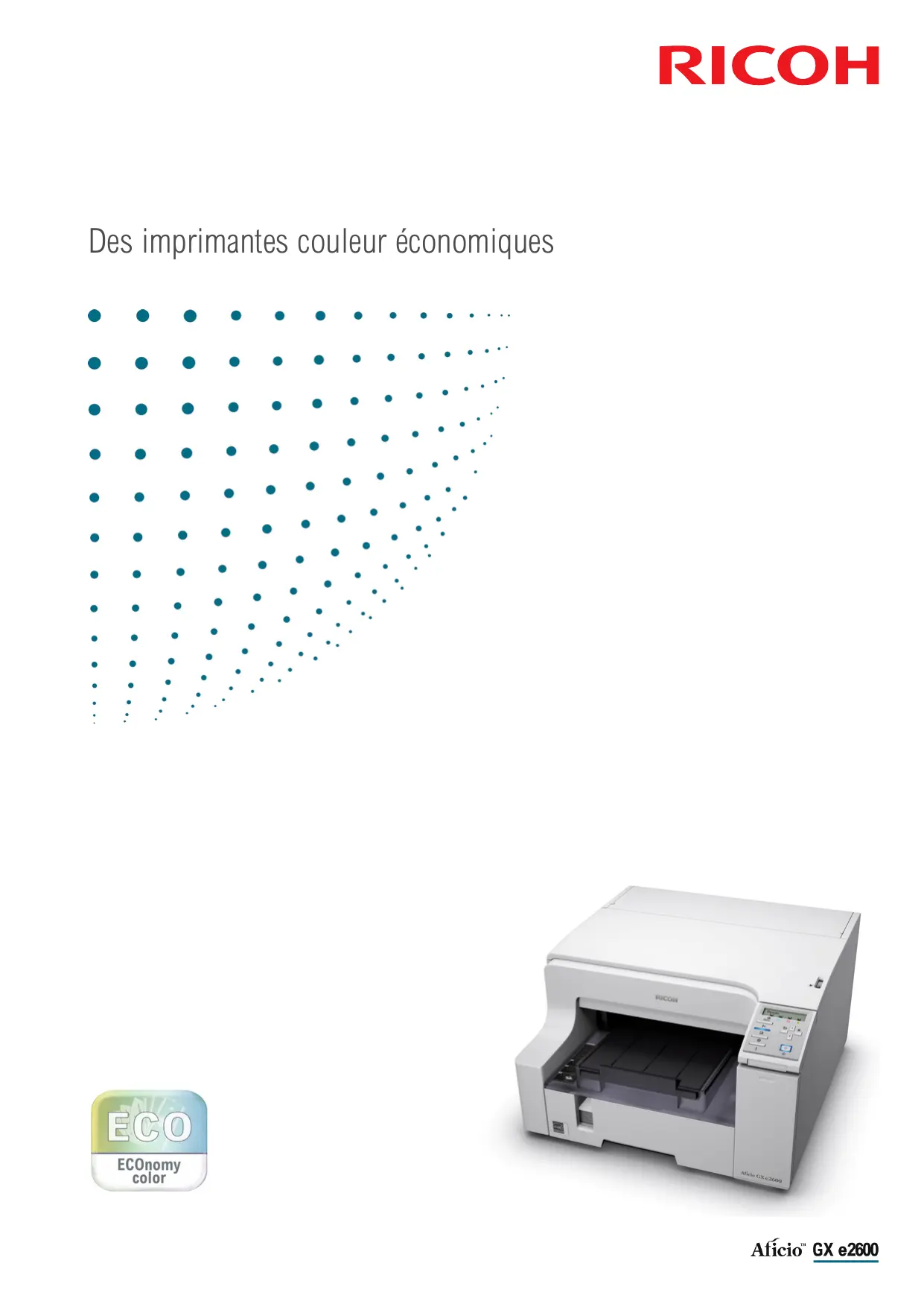 Des imprimantes couleur économiques Des systèmes avec un excellent rapport coûtefficacité Certaines imprimantes couleur ont tout pour elles ! Rapide, productive, économique et d’un prix abordable, l’Aficio™GX e2600 combine toutes ces caractéristiques. Cette nouvelle imprimante GelSprinter™ est équipée du mode Couleur ÉCOnomique unique de Ricoh, qui offre les avantages de la couleur à un coût réduit. La solution idéale pour les petites entreprises et l’informatique individuelle. Productivité élevée : jusqu’à 29 ppm. Faible coût total de possession (TCO). Qualité optimale sur papier ordinaire. Coût de la couleur ÉCOnomique proche du N&B. Facilité d’utilisation. De nombreux avantages pour les petites entreprises