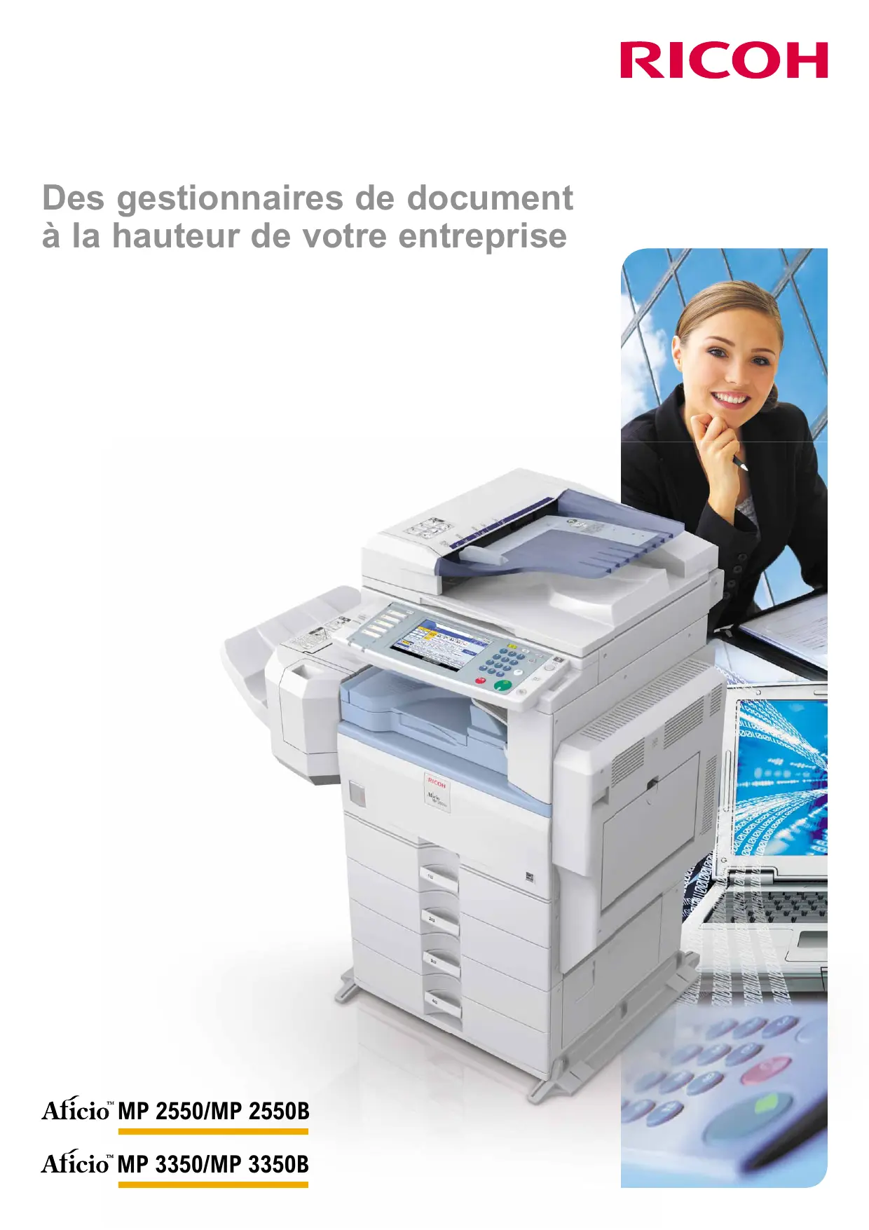 Des gestionnaires de document à la hauteur de votre entreprise MP 2550/MP 2550B MP 3350/MP 3350B La réponse à tous vos besoins de traitement de documents Donne le ton en noir et blanc Les Aficio™MP 2550/MP 2550B et Aficio™MP 3350/MP 3350B ultra-performants vous permettent d’atteindre un nouveau niveau de productivité bureautique. Entièrement sur-mesure, ces solutions bureautiques multifonctions réunissent de multiples fonctionnalités visant à rationaliser vos flux de documents. De plus, vous bénéficiez de la technologie de pointe qui caractérise les produits Ricoh : facilité d’utilisation, haute productivité et nouveaux modes de communication de vos documents. Grâce à ces systèmes perfectionnés vous disposez de tous les moyens pour rendre vos communications plus efficaces. MP 2550/MP 2550B