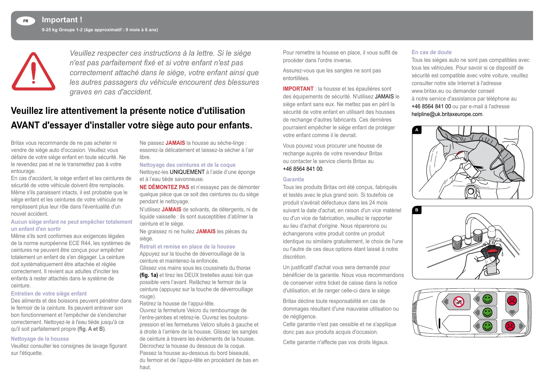 AVANT d'essayer d'installer votre siège auto pour enfants. Britax vous recommande de ne pas acheter ni vendre de siège auto d'occasion. Veuillez vous défaire de votre siège enfant en toute sécurité. Ne le revendez pas et ne le transmettez pas à votre entourage. En cas d'accident, le siège enfant et les ceintures de sécurité de votre véhicule doivent être remplacés. Même s'ils paraissent intacts, il est probable que le siège enfant et les ceintures de votre véhicule ne remplissent plus leur rôle dans l'éventualité d'un nouvel accident. Aucun siège enfant ne peut empêcher totalement un enfant d'en sortir Même s'ils sont conformes aux exigences légales de la norme européenne ECE R44, les systèmes de ceintures ne peuvent être conçus pour empêcher totalement un enfant de s'en dégager. La ceinture doit systématiquement être attachée et réglée correctement. Il revient aux adultes d'inciter les enfants à rester attachés dans le système de ceinture. Entretien de votre siège enfant Des aliments et des boissons peuvent pénétrer dans le fermoir de la ceinture. Ils peuvent entraver son bon fonctionnement et l'empêcher de s'enclencher correctement. Nettoyez-le à l'eau tiède jusqu'à ce qu'il soit parfaitement propre (fig. A et B). Nettoyage de la housse Veuillez consulter les consignes de lavage figurant sur l'étiquette.
