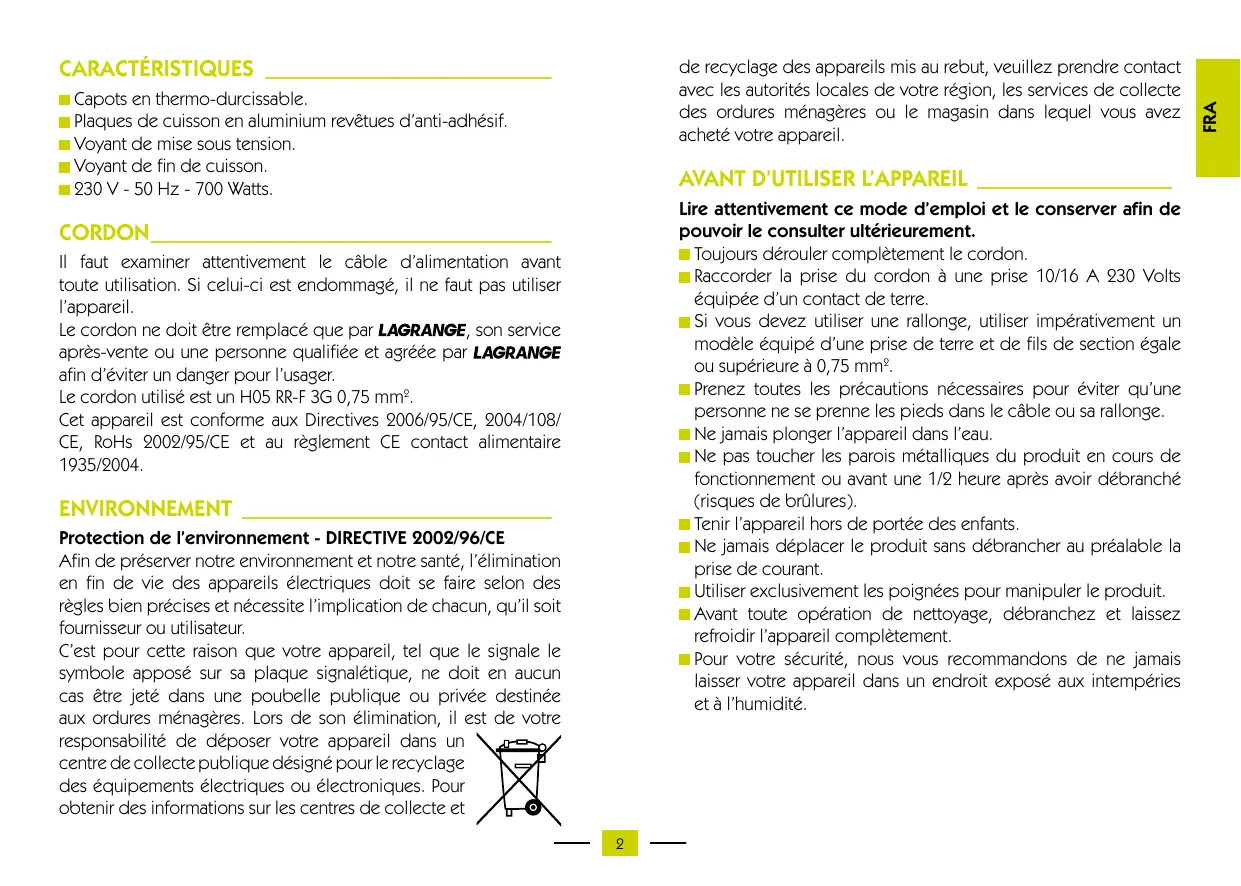 Le cordon ne doit être remplaceé que par LAGRANGE, son service après-vente ou une personne qualifiée et/agreee par LAGRANGE afin d'eviter un danger pour l'usager.