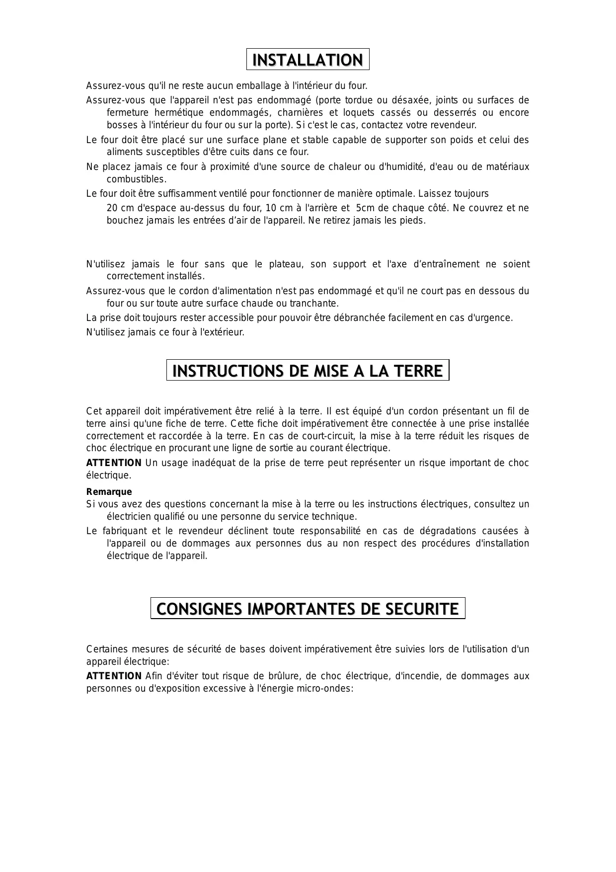 Certaines mesures de sécurité de bases doivent impérativement être suivies lors de l'utilisation d'un appareil électrique: ATTENTION Afin d'éviter tout risque de brûlure, de choc électrique, d'incendie, de dommages aux personnes ou d'exposition excessive à l'énergie micro-ondes: Lisez attentivement ces instructions avant le premier usage de votre appareil. N'utilisez cet appareil que pour les usages décrits dans ce mode d'emploi. N'utilisez jamais de produits chimiques ou de sprays corrosifs dans cet appareil. Ce four est spécifiquement destiné au réchauffage et à la cuisson des aliments. Il n'est pas destiné à un usage industriel ou expérimental. N'utilisez jamais cet appareil à vide. N'utilisez jamais l'appareil lorsque la prise ou le cordon d'alimentation est endommagé, lorsqu'il ne fonctionne pas normalement ou encore lorsqu'il a subi des dégradations ou qu'il est tombé. Dans tous les cas, rapportez le à votre service après-vente. Comme tout autre appareil, il nécessite une surveillance accrue lorsqu'il est utilisé par des enfants. Afin de réduire le risque d'incendie dans la cavité du four: a. Lorsque vous réchauffez des aliments contenus dans du plastique ou du papier, contrôlez régulièrement pour limiter le risque d'incendie. b. Retirez les attaches métalliques des sacs de papier ou de plastique avant de les placer dans le four. c. Si vous observez de la fumée, éteignez et débranchez l'appareil immédiatement et laissez la porte du four fermée afin d'étouffer les flammes. d. N'utilisez jamais l'appareil à des fins de rangement. Ne laissez jamais de papier, d'ustensiles de cuisine ou d'aliments à l'intérieur du four lorsqu'il n'est pas utilisé. N'utilisez jamais de récipients hermétiques pour réchauffer des liquides ou autres aliments; ils risquent d'exploser à tout moment. Le réchauffement de liquides par micro-ondes peut provoquer une ébullition éruptive retardée. Soyez donc particulièrement attentif lors de la manipulation des récipients. Ne faites jamais frire d'aliments dans le four. L'huile peut en effet endommager votre appareil ou vos ustensiles et même vous causer des brûlures. Ne réchauffez jamais d'œufs entiers dans le four, ils risquent d'exploser. Percez les aliments ayant une peau épaisse tels que les pommes de terre, les courges, les pommes ou les châtaignes avant de les mettre au four. Après réchauffage des petits pots ou biberons pour bébés, agitez pour répartir la chaleur et vérifiez la température pour éviter toute brûlure. Les récipients de cuisson peuvent devenir très chauds par le transfert de chaleur. Utilisez des gants isolants pour les manipuler. Assurez-vous que les récipients utilisés conviennent pour le four à micro-ondes. ATTENTION: Ne changez pas le cordon d’alimentation, n'effectuez jamais d'entretien, de réparations ou d'opérations impliquant le démontage d'un couvercle constituant une protection contre l'énergie micro-ondes. Ces manipulations peuvent s'avérer très dangereuses et doivent impérativement être effectuées par une personne qualifiée afin d’éviter tout danger.