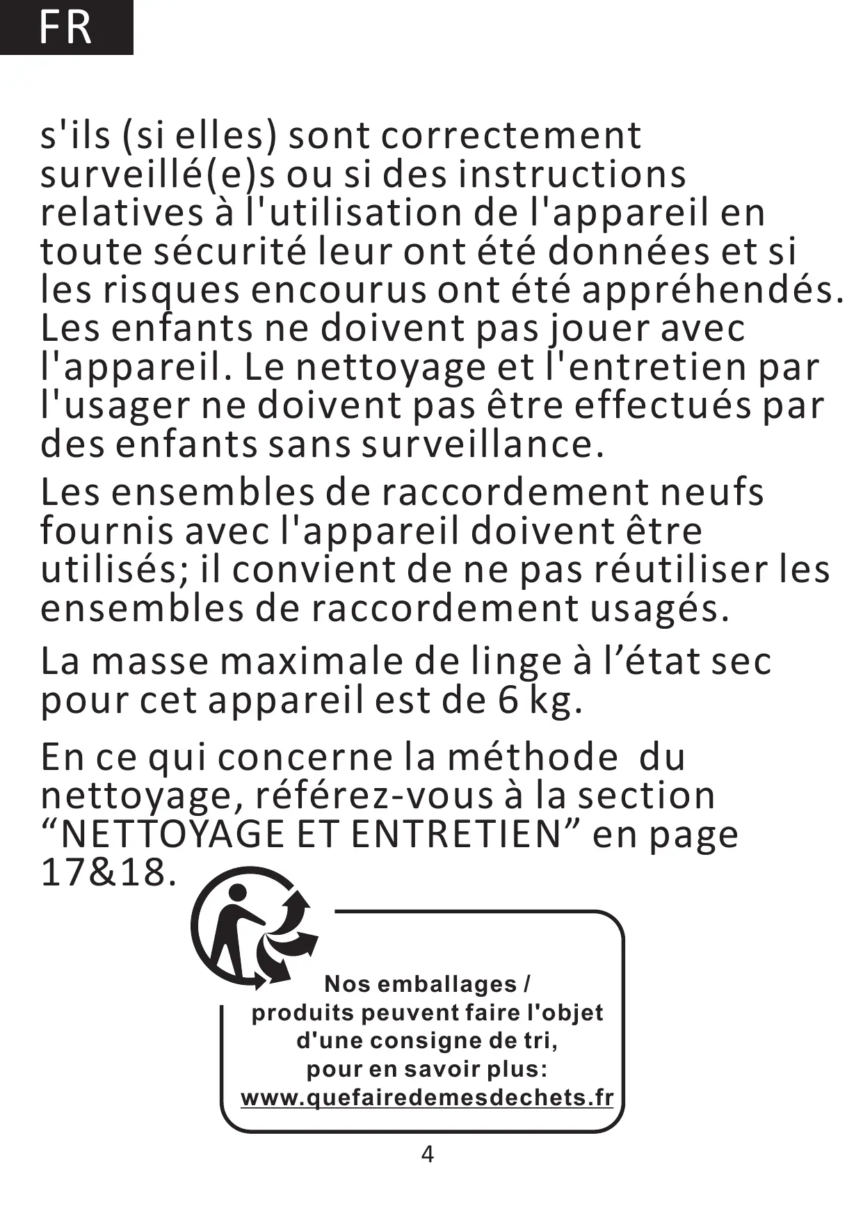 Les enfants ne doivent pas jouer avec l'appareil. Le nettoyage et l'entretien par l'usager ne doivent pas être effectués par des enfants sans surveillance. Les ensembles de raccordement neufs fournis avec l'appareil doivent être utilisés; il convient de ne pas réutiliser les ensembles de raccordement usagés. La masse maximale de linge à l’état sec pour cet appareil est de 6 kg. En ce qui concerne la méthode du nettoyage, référez-vous à la section “NETTOYAGE ET ENTRETIEN” en page 17&18. Nos emballages / produits peuvent faire l'objet d'une consigne de tri, pour en savoir plus: www.quefairedemesdechets.fr