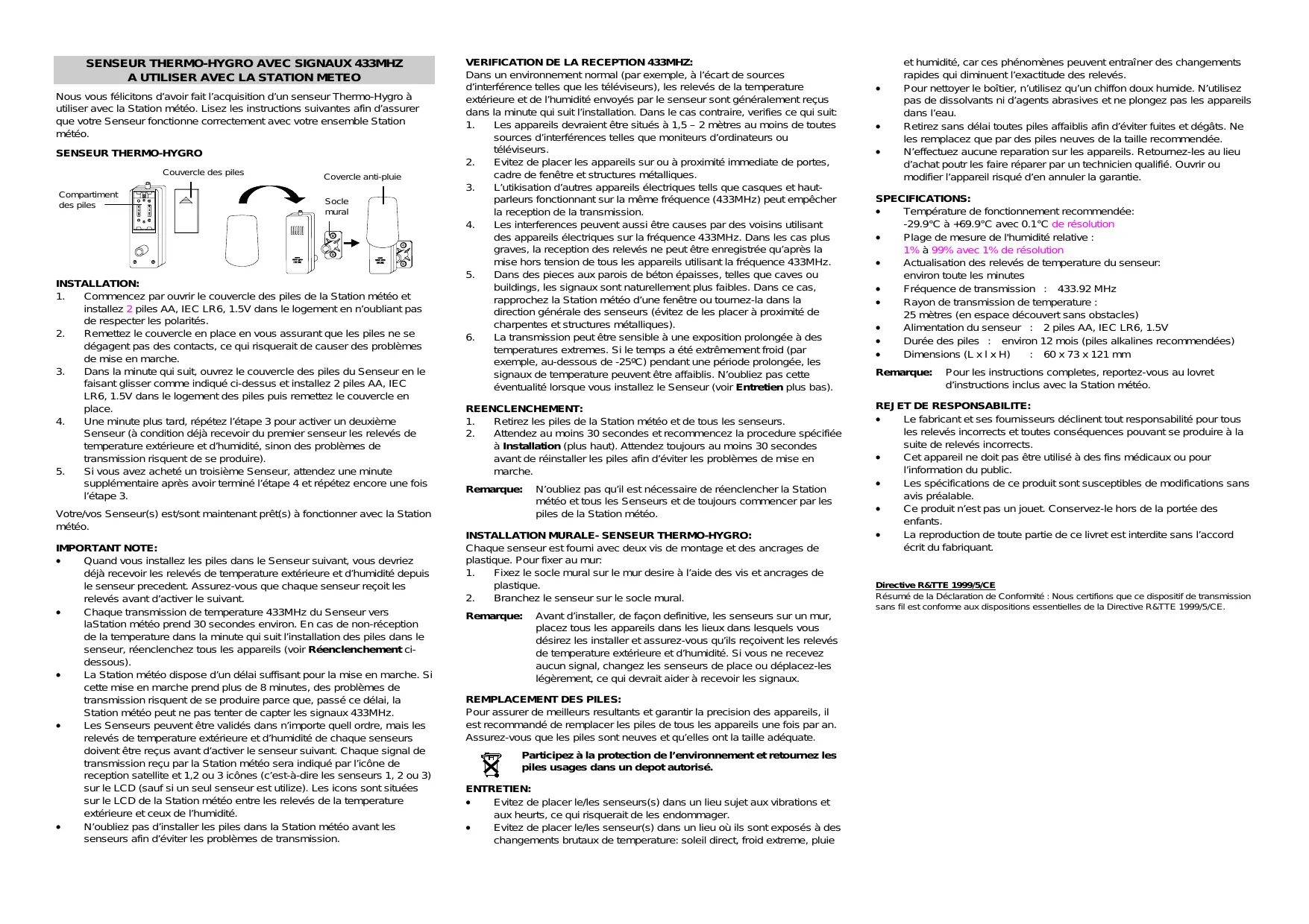 et humidité, car ces phénomènes peuvent entraîner des changements rapides qui diminuent l’exactitude des relevés. Pour nettoyer le boîtier, n’utilisez qu’un chiffon doux humide. N’utilisez pas de dissolvants ni d’agents abrasives et ne plongez pas les appareils dans l’eau. Retirez sans délai toutes piles affaiblis afin d’éviter fuites et dégâts. Ne les remplacez que par des piles neuves de la taille recommendée. N’effectuez aucune reparation sur les appareils. Retournez-les au lieu d’achat poutr les faire réparer par un technicien qualifié. Ouvrir ou modifier l’appareil risqué d’en annuler la garantie. SPECIFICATIONS: Température de fonctionnement recommendée: -29.9°C à +69.9°C avec 0.1°C de résolution Plage de mesure de l'humidité relative : 1% à 99% avec 1% de résolution Actualisation des relevés de temperature du senseur: environ toute les minutes Fréquence de transmission : 433.92 MHz Rayon de transmission de temperature : 25 mètres (en espace découvert sans obstacles) Alimentation du senseur : 2 piles AA, IEC LR6, 1.5V Durée des piles : environ 12 mois (piles alkalines recommendées) Dimensions (L x l x H) : 60 x 73 x 121 mm Remarque: Pour les instructions completes, reportez-vous au lovret d’instructions inclus avec la Station météo. REJET DE RESPONSABILITE: Le fabricant et ses fournisseurs déclinent tout responsabilité pour tous les relevés incorrects et toutes conséquences pouvant se produire à la suite de relevés incorrects. Cet appareil ne doit pas être utilisé à des fins médicaux ou pour l’information du public. Les spécifications de ce produit sont susceptibles de modifications sans avis préalable. Ce produit n’est pas un jouet. Conservez-le hors de la portée des enfants. La reproduction de toute partie de ce livret est interdite sans l’accord écrit du fabriquant. Directive R&TTE 1999/5/CE Résumé de la Déclaration de Conformité : Nous certifions que ce dispositif de transmission sans fil est conforme aux dispositions essentielles de la Directive R&TTE 1999/5/CE.