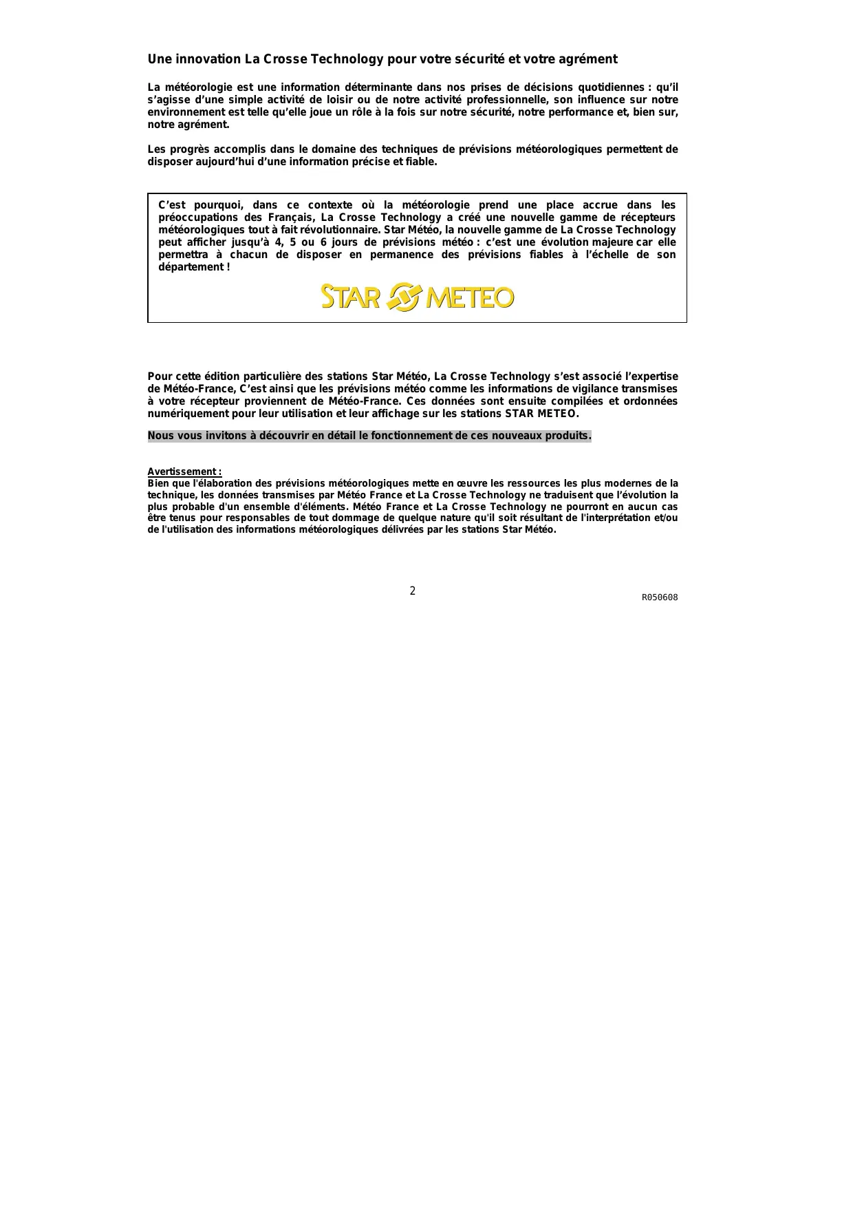 Bien que l'élaboration des prévisions météorologiques mette en œuvre les ressources les plus modernes de la technique, les données transmises par Météo France et La Crosse Technology ne traduisent que l’évolution la plus probable d'un ensemble d'éléments. Météo France et La Crosse Technology ne pourront en aucun cas être tenus pour responsables de tout dommage de quelque nature qu'il soit résultant de l'interprétation et/ou de l'utilisation des informations météorologiques délivrées par les stations Star Météo.