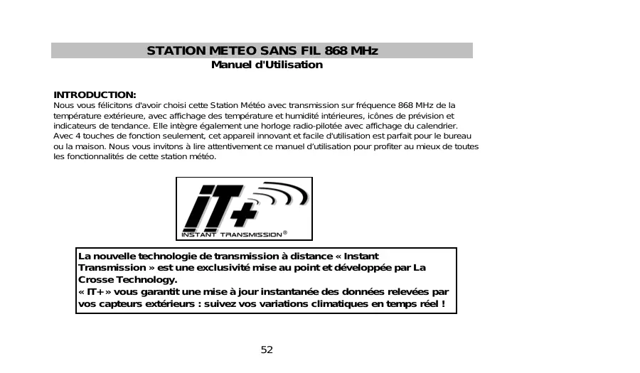 STATION METEO SANS FIL 868 MHz Manuel d'Utilisation INTRODUCTION: Nous vous félicitons d'avoir choisi cette Station Météo avec transmission sur fréquence 868 MHz de la température extérieure, avec affichage des température et humidité intérieures, icônes de prévision et indicateurs de tendance. Elle intègre également une horloge radio-pilotée avec affichage du calendrier. Avec 4 touches de fonction seulement, cet appareil innovant et facile d'utilisation est parfait pour le bureau ou la maison. Nous vous invitons à lire attentivement ce manuel d’utilisation pour profiter au mieux de toutes les fonctionnalités de cette station météo. La nouvelle technologie de transmission à distance « Instant Transmission » est une exclusivité mise au point et développée par La Crosse Technology. « IT+ » vous garantit une mise à jour instantanée des données relevées par vos capteurs extérieurs : suivez vos variations climatiques en temps réel !