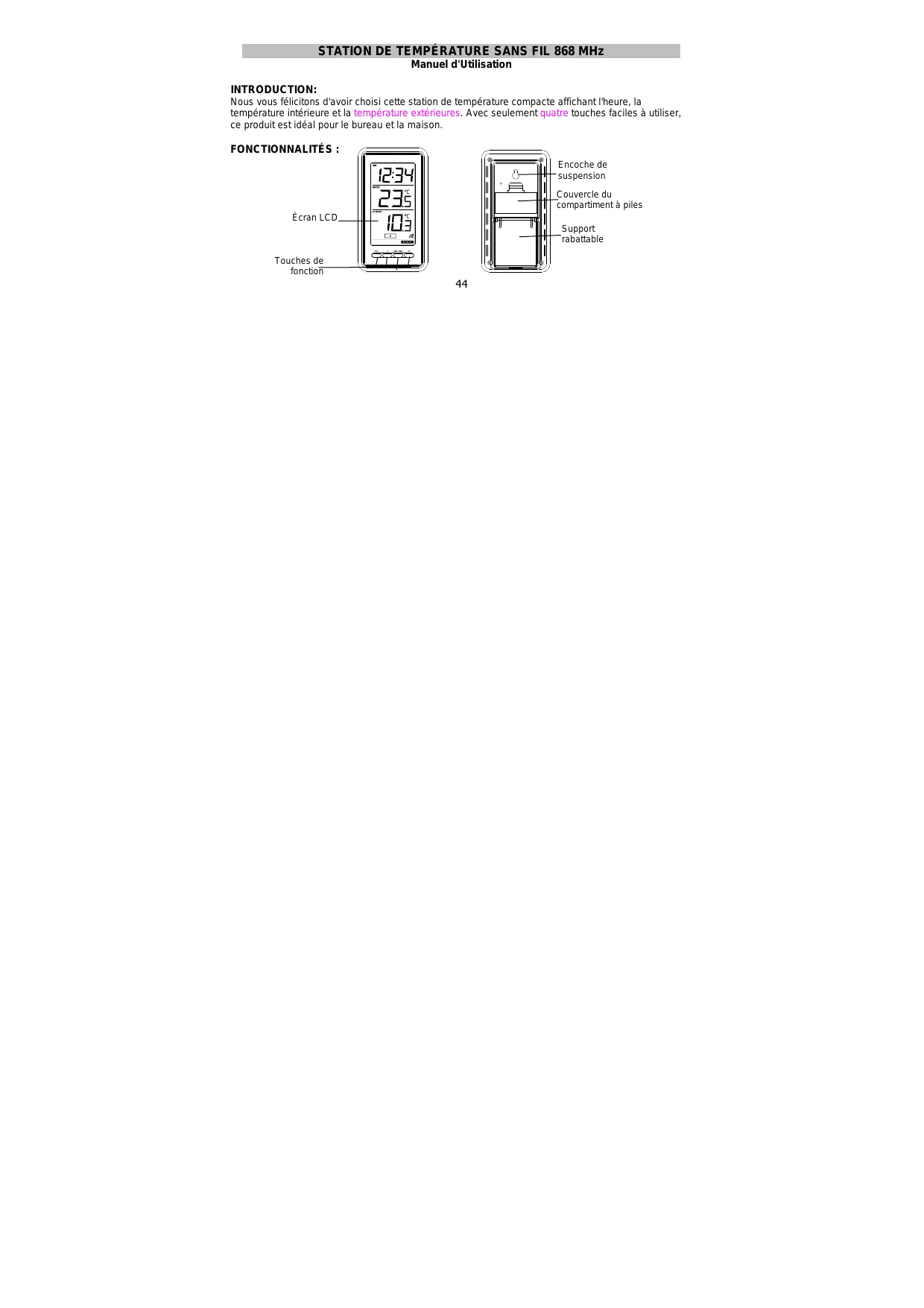 STATION DE TEMPÉRATURE SANS FIL 868 MHz Manuel d'Utilisation INTRODUCTION: Nous vous félicitons d'avoir choisi cette station de température compacte affichant l'heure, la température intérieure et la température extérieures. Avec seulement quatre touches faciles à utiliser, ce produit est idéal pour le bureau et la maison. FONCTIONNALITÉS : Encoche de suspension Couvercle du compartiment à piles Écran LCD Support rabattable Touches de fonction