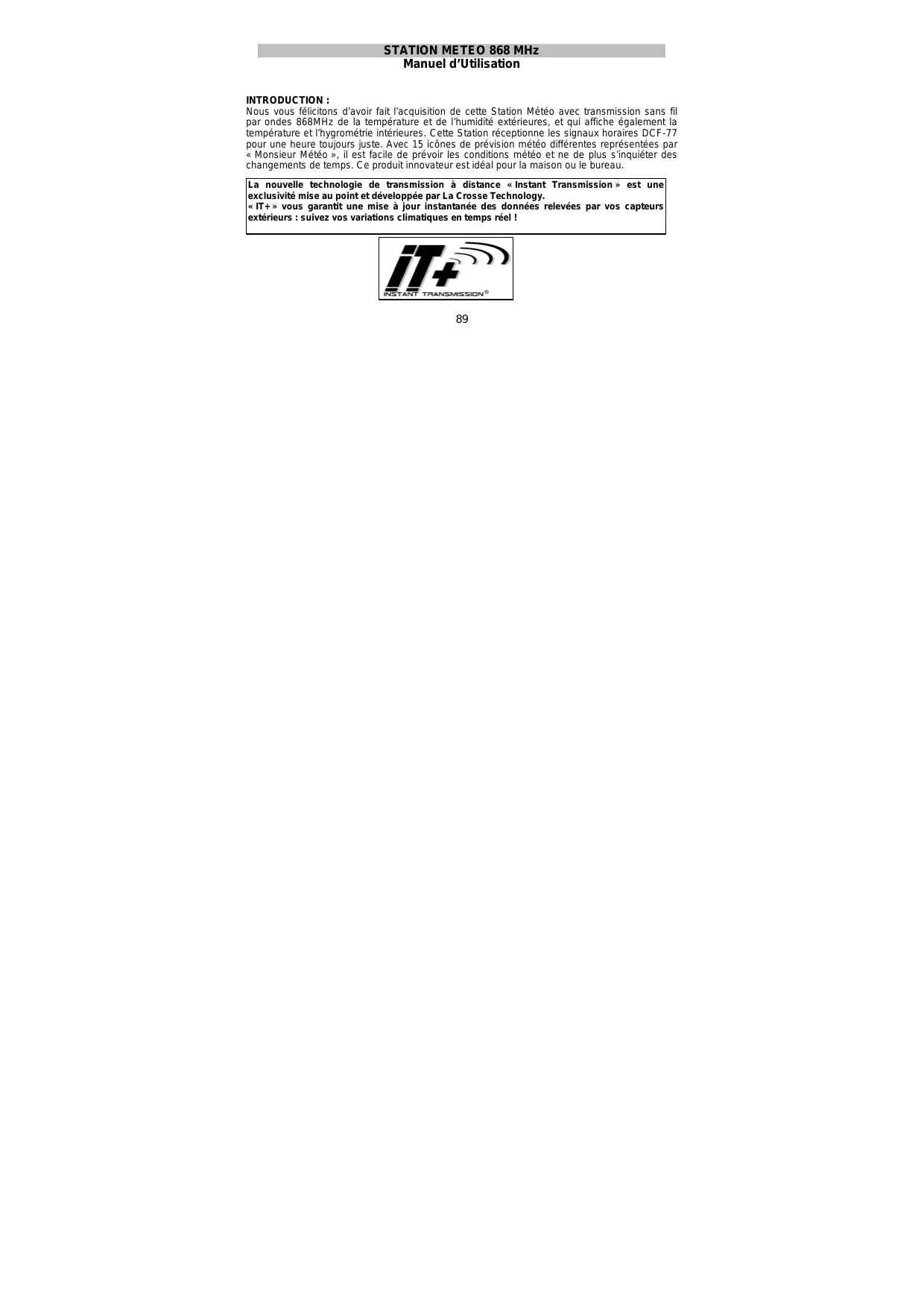 STATION METEO 868 MHz Manuel d’Utilisation INTRODUCTION : Nous vous félicitons d’avoir fait l’acquisition de cette Station Météo avec transmission sans fil par ondes 868MHz de la température et de l’humidité extérieures, et qui affiche également la température et l’hygrométrie intérieures. Cette Station réceptionne les signaux horaires DCF-77 pour une heure toujours juste. Avec 15 icônes de prévision météo différentes représentées par « Monsieur Météo », il est facile de prévoir les conditions météo et ne de plus s’inquiéter des changements de temps. Ce produit innovateur est idéal pour la maison ou le bureau. La nouvelle technologie de transmission à distance « Instant Transmission » est une exclusivité mise au point et développée par La Crosse Technology. « IT+ » vous garantit une mise à jour instantanée des données relevées par vos capteurs extérieurs : suivez vos variations climatiques en temps réel !