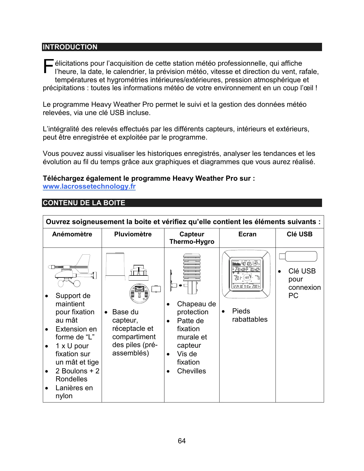 Téléchargez également le programme Heavy Weather Pro sur : www.lacrossetechnology.fr CONTENU DE LA BOITE Ouvrez soigneusement la boite et vérifiez qu’elle contient les éléments suivants : Anémomètre
