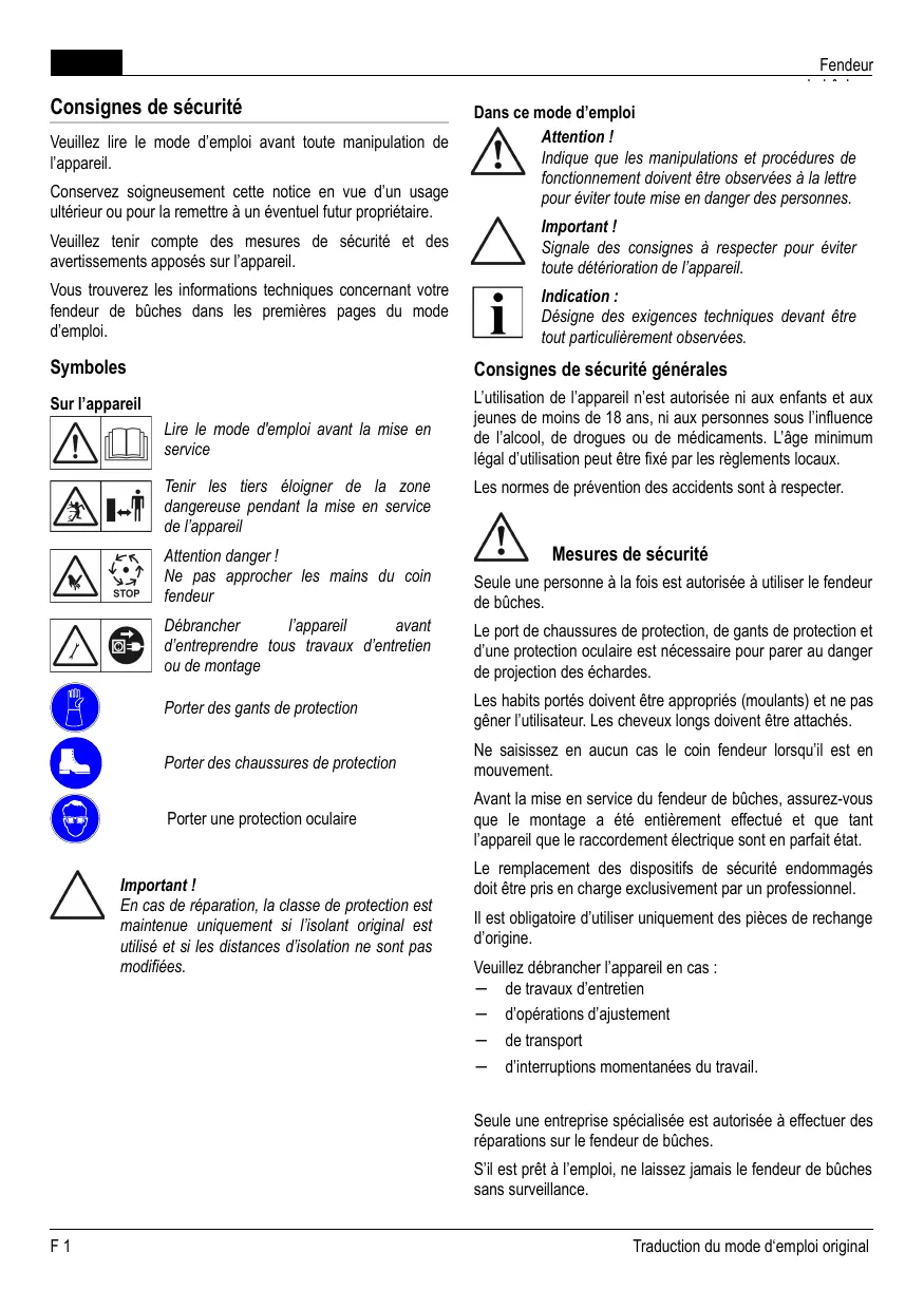 Il est obligatoire d’utiliser uniquement des pièces de rechange d’origine. Veuillez débrancher l’appareil en cas : − de travaux d’entretien − d’opérations d’ajustement − de transport − d’interruptions momentanées du travail. Seule une entreprise spécialisée est autorisée à effectuer des réparations sur le fendeur de bûches. S’il est prêt à l’emploi, ne laissez jamais le fendeur de bûches sans surveillance.