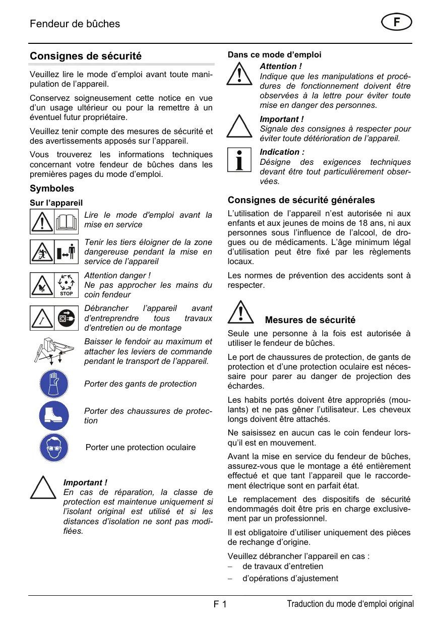 Fendeur de bûches Dans ce mode d’emploi Attention ! Indique que les manipulations et procédures de fonctionnement doivent être observées à la lettre pour éviter toute mise en danger des personnes.