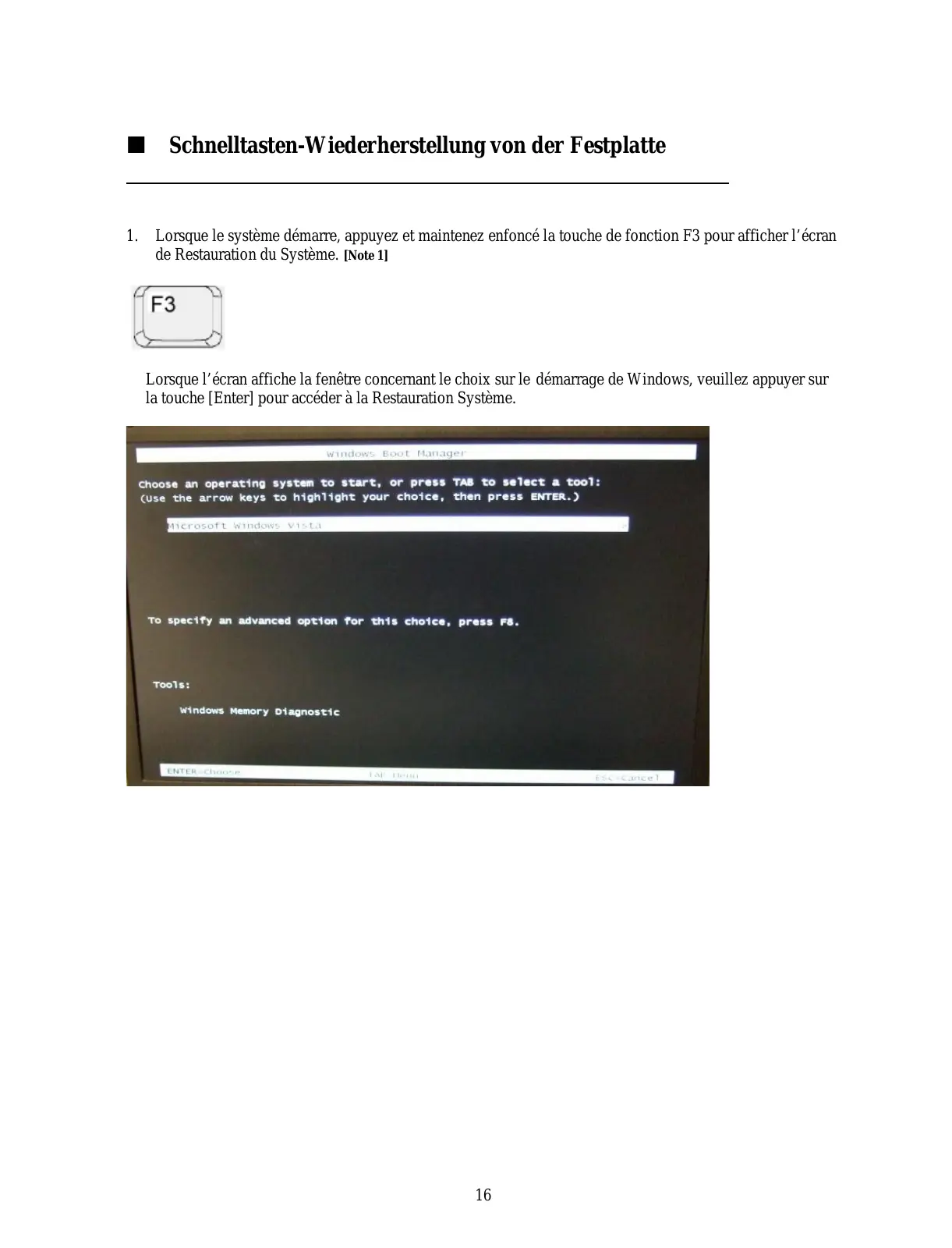 Lorsque le système démarre, appuyez et maintenez enfoncé la touche de fonction F3 pour afficher l’écran de Restauration du Système. [Note 1] Lorsque l’écran affiche la fenêtre concernant le choix sur le démarrage de Windows, veuillez appuyer sur la touche [Enter] pour accéder à la Restauration Système.
