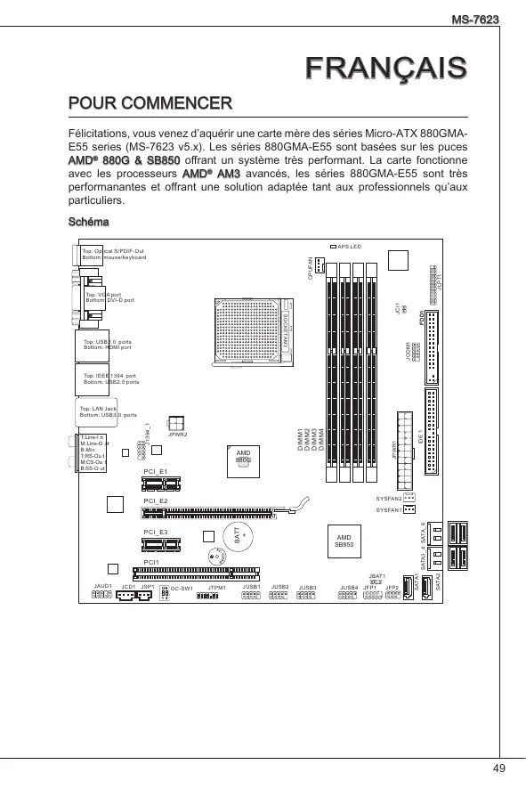 MS-7623 Français Pour commencer Félicitations, vous venez d’aquérir une carte mère des séries Micro-ATX 880GMAE55 series (MS-7623 v5.x). Les séries 880GMA-E55 sont basées sur les puces AMD® 880G & SB850 offrant un système très performant. La carte fonctionne avec les processeurs AMD® AM3 avancés, les séries 880GMA-E55 sont très performanantes et offrant une solution adaptée tant aux professionnels qu’aux particuliers. Schéma APS LED JLPT1 CPUFAN Top: Optical S/PDIF-Out Bottom: mouse/keyboard JCOM1 SOCKET AM3 Top: USB2.0 ports Bottom: HDMI port FDD1 JCI1 Top: VGA port Bottom: DVI-D port Top: IEEE 1394 port Bottom: USB2.0 ports AMD 880G IDE 1 JPWR2 JPWR1 T: Line-I n M: Line-O ut B: Mic T:RS-Ou t M:CS-Ou t B:SS-O ut DIMM1 DIMM2 DIMM3 DIMM4 J1394_1 Top: LAN Jack Bottom: USB3.0 ports PCI_E1 SYSFAN2 PCI_E2 SATA3_4 SATA_6 PCI1 JBAT1 JAUD1 JCD1 JSP1 OC-SW1 JTPM1 JUSB1 JUSB2 JUSB3 JUSB4 JFP1 JFP2 SATA2 AMD SB850 SATA1 BATT