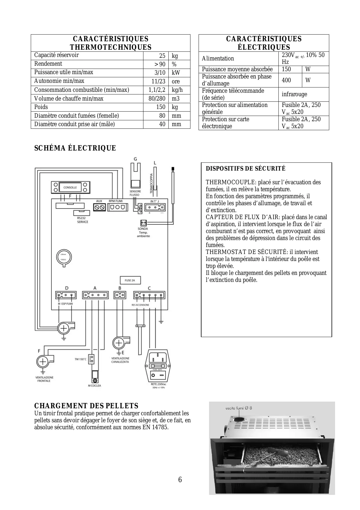 THERMOCOUPLE: placé sur l’évacuation des fumées, il en relève la température. En fonction des paramètres programmés, il contrôle les phases d’allumage, de travail et d’extinction. CAPTEUR DE FLUX D’AIR: placé dans le canal d’aspiration, il intervient lorsque le flux de l’air comburant n’est pas correct, en provoquant ainsi des problèmes de dépression dans le circuit des fumées. THERMOSTAT DE SÉCURITÉ: il intervient lorsque la température à l'intérieur du poêle est trop élevée. Il bloque le chargement des pellets en provoquant l’extinction du poêle.