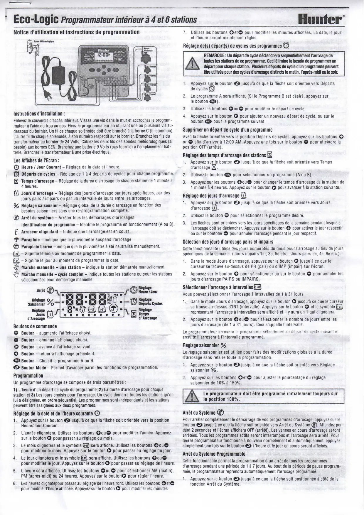 ECO-LOGIC - Programmateur d'arrosage HUNTER - Notice d'utilisation et mode d'emploi gratuit