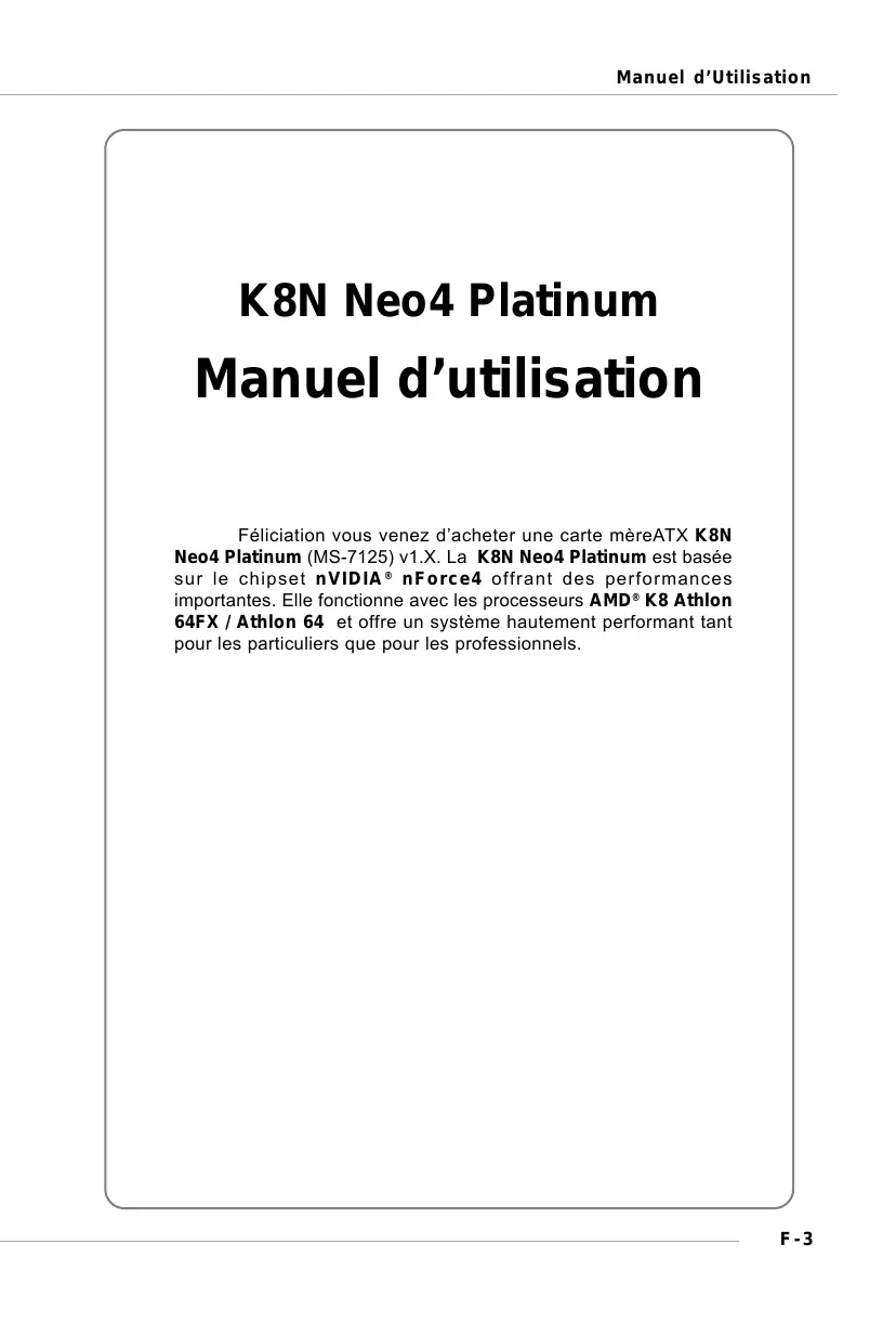 Started K8N Neo4 Platinum Manuel d’utilisation Féliciation vous venez d’acheter une carte mèreATX K8N Neo4 Platinum (MS-7125) v1.X. La K8N Neo4 Platinum est basée sur le chipset nVIDIA ® nForce4 offrant des performances importantes. Elle fonctionne avec les processeurs AMD® K8 Athlon 64FX / Athlon 64 et offre un système hautement performant tant pour les particuliers que pour les professionnels. F-3 Carte Mère ATX MS-7125 Spécificités de la Carte CPU h Processeur AMD K8 Socket-939 pour Athlon 64 FX / Athlon 64 h Jusqu’à Athlon64 3500+, 3800+ ou supérieur (Pour une mise à jour sur les dernières informations CPU, veuillez visiter : http:// www.msi.com.tw/program/products/mainboard/mbd/pro_mbd_cpu_support.php) Chipset h nVIDIA nForce4 Ultra - Lien HyperTransport avec le CPU AMD Athlon 64/Athlon 64 FX CPU - HyperTransport support une vitesse maxi de 1GHz (2000MT/s) - Supporte l’interface PCI Express x16/x1/x2 - Deux contrôleurs SATA indépendants pour quatre disques - Contrôleurs Dual Fast ATA-133 IDE - IEEE802.3 nVIDIA MAC pour 1000BASE-T Mémoire Principale h Support du double canal, 8 banques de mémoire DDR 266/333/400 184 broches h Supporte un maximum de mémoire de 4GB h Supporte le 2.5v DDR SDRAM DIMM (Pour une mise à jour sur les modules de mémoire, veuillez vivister : http://www.msi. com.tw/program/products/mainboard/mbd/pro_mbd_trp_list.php.) Slots h Un slot PCI Express x16 slot (supportant les spec. PCI Express Bus v1.0a) h Un slot PCI Express x1 slots (supportant les spec. PCI Express Bus v1.0a) h Un slot PCI Express x4 (supportant PCI Express x2 uniquement ) h Quatre slots 32-bit Master PCI Bus, slot orange réservé pour une carte de commuinication. h Supporte l’interface 3.3V/5V PCI bus IDE Intégré h Un contrôleur IDE sur le chipset nVIDIA® nForce4 Ultra procurant IDE HDD/CDROM avec PIO, Bus Master et les modes opératoires Ultra DMA 66/100/133 h Can connect up to 4 IDE devices SATA Intégré h Suporte NV RAID 4 ports SATA (SATA1-4). Le taux de transfert du SATAII est de 300MB/s maximum. h Silicon Image’s SATARAID5TM supportant 4 autres ports SATA (SATA5-8). Le taux de transfert SATA est de 150MB/s. (Option) F-4 Manuel d’Utilisation Interface USB h 10 ports USB - Contrôllé par le chipset nForce4 Ultra - 4 ports à l’arrière, 6 ports via bracket externe NV RAID (Logiciel) h Supporte jusqu’à 4 SATA et 4 ATA133 disques durs - RAID 0 or 1, 0+1, JBOD sont supportés - Fonction RAID disponible pour les disques durs PATA+SATA Silicon Image’s SATARAID5TM (logiciel) (Option) h RAID 0 ou 1, RAID5, RAID10, et groupes JBOD sont supportés h Supporte jusqu’à 4 SATA connecté à un simple connecteur Dual LAN (Optional) h Supporte dual LAN jack - 1er LAN supportant 10/100/1000 Fast Ethernet par Marvell 88E1111 - 2ème LAN supportant 10/100/1000 Fast Ethernet par Marvell 88E8053 IEEE 1394 (Option) h Supporte jusqu’à 2 ports 1394 (panneau arrière x 1, broches x 1). Taux de transfert jusqu’à 400Mbps Audio h Chip intégré Realtek ALC850 - Direct Sound AC97 audio - 7.1 canaux en sortie Périphériques Intégrés h Les périphériques intégrés sont : - 1 port floppy supportant 1 FDD avec 360K, 720K, 1.2M, 1.44M et 2.88Mbytes - 1 port série - 1 port parallèle supportant les modes SPP/EPP/ECP - 1 Audio jack(5-in-1), coaxial/fiber SPDIF out - 1 jeu de broches IrDA - 1 jeu de broches CD-In - 1 jeu de broches D-Bracket2 - 2 ports IEEE1394 (Arrière * 1 / Façade * 1)(Option) - 10 ports USB1.1/2.0 (Arrière * 4 / Façade * 6) F-5 Carte Mère ATX MS-7125 BIOS h Le BIOS est “Plug & Play” ce qui permet nue détection automatique des périphériques et/ou cartes d’extensions. h La carte mère procure une interface DMI (Desktop Management Interface) qui permet d’enregistrer les spécificités de la carte. h Supporte le boot à partir : LAN, matériel USB 1.1 & 2.0, et disque dur SATA. Dimension h Format ATX (30.4 cm X 24.4 cm) Montage h 9 trous de montage MSI Vous Rappelle...