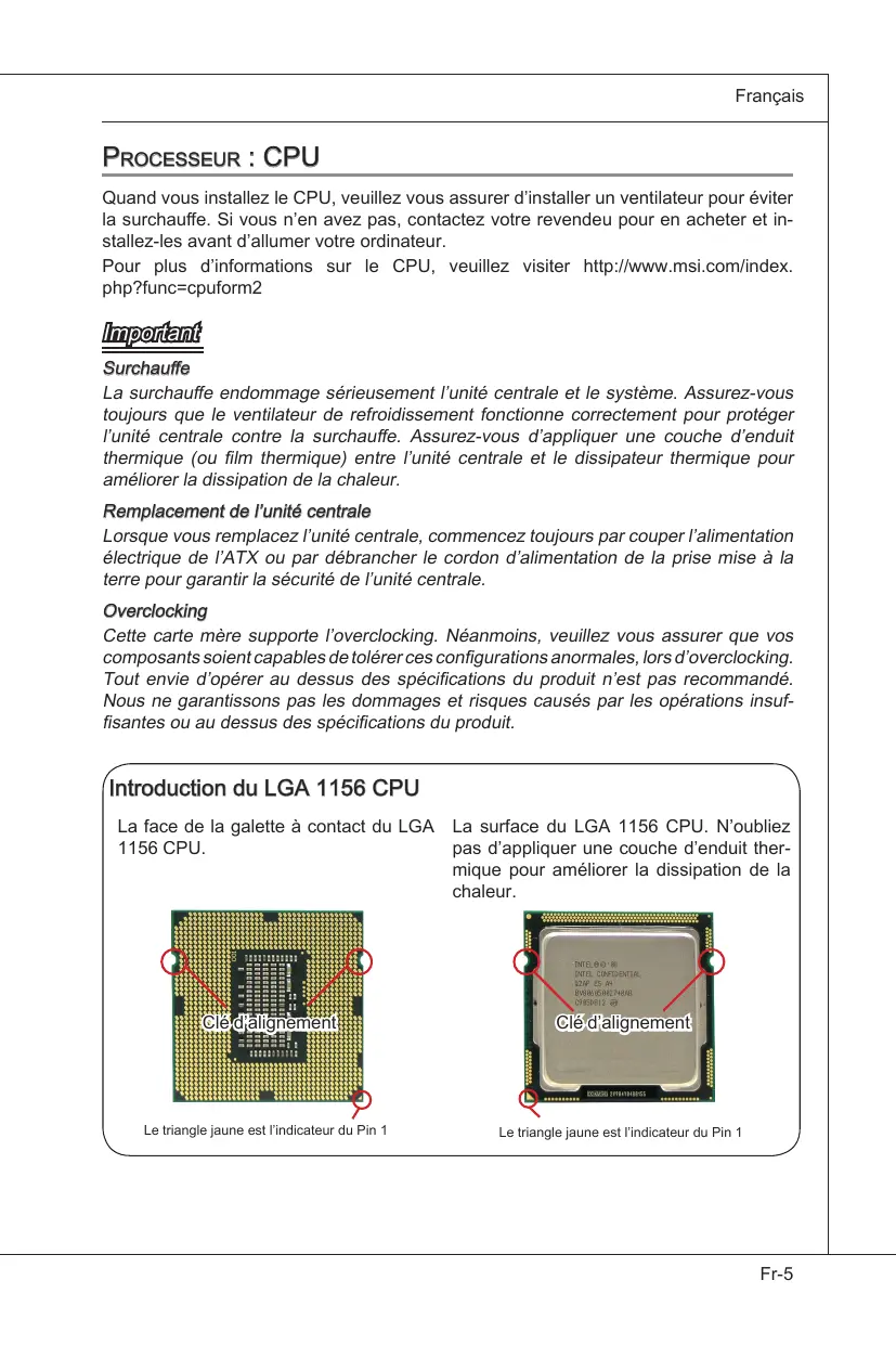 CPU pour joindre correctement, déposez le CPU dans l’armature du logement de douille. Faites attention au bord de sa base. Notez qu’on aligne les coins assortis. Clé d’alignement Fr-6 Français