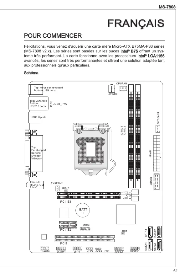 화면상의 지침에 따라 설치를 완료하세요. MS-7808 FrançaiS Pour coMMencer Félicitations, vous venez d’aquérir une carte mère Micro-ATX B75MA-P33 séries (MS-7808 v2.x). Les séries sont basées sur les puces Intel® B75 offrant un système très performant. La carte fonctionne avec les processeurs Intel® LGA1155 avancés, les séries sont très performanantes et offrent une solution adaptée tant aux professionnels qu’aux particuliers. Schéma CPUFAN Top: mouse or keyboard Bottom:USB ports JPWR2 JUSB_PW2 SYSFAN1 Top: LAN Jack Bottom: USB2.0 ports DIMM1 DIMM2 USB3.0 ports JUSB3 T:Line-In M:Line- Out B:MIC JPWR1 Top: Parallel port Bottom: DVI port VGA port SYSFAN2 JBAT1 PCI_E1 BATT