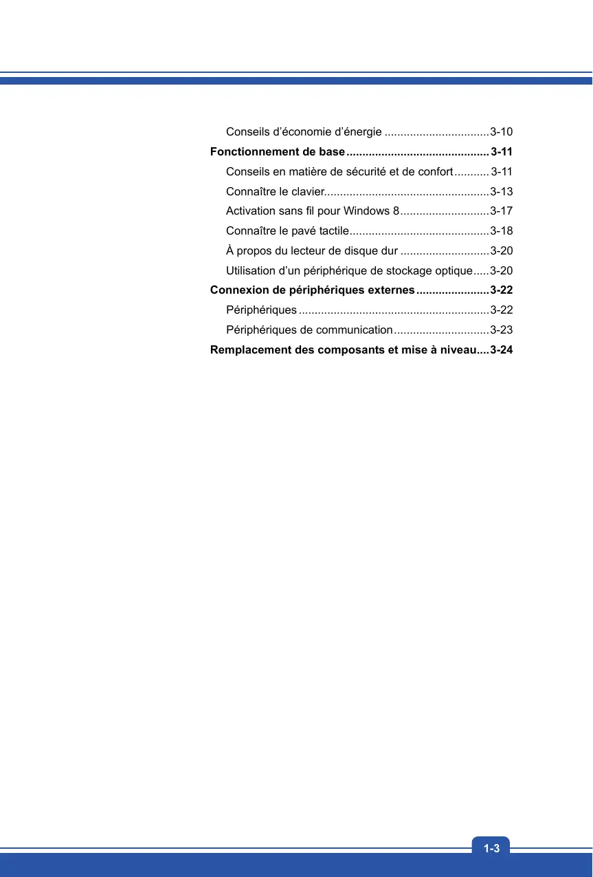 Le périphérique montré ici n’est qu’une référence. 3-21 Pour commencer Connexion de périphériques externes Les ports I/O (entrée/sortie) de l’ordinateur portable vous permettent d’y brancher des périphériques. Tous les périphériques indiqués ci-dessous ne sont donnés qu’à titre d’exemple. Périphériques 3-22 1-23 Périphériques de communication Les fonctions montrées ici sont supportées en option, selon le modèle que vous achetez. Contactez le distributeur local pour plus d’information. 3-23 Pour commencer Remplacements des composants et mise à niveau Veuillez noter que, selon le modèle acheté, la mémoire, le lecteur de disque dur, le modèle wireless LAN / Bluetooth et l’ensemple batterie préinstallés dans le produit peuvent être mises à jour ou remplacés à la demande de l’utilisateur. L’ordinateur dispose d’un ensemble batterie au lithium-ion de haute capacité. Il est remplacé par l’utilisateur. L’ordinateur dispose d’un lecteur de disque optique, et le périphérique de stockage est mis à jour et remplacé par un technicien autorisé ou le centre de service. 3-24 1-25 L’ordinateur dispose d’un lecteur de disque dur, et le périphérique de stockage est mis à jour et remplacé par un technicien autorisé ou le centre de service. Des modèles de mémoire supplémentaire peuvent être installées par un technicien autorisé ou le centre de service afin d’augmenter la performance de l’ordinateur, selon la limitation de spécifications. Pour en savoir plus sur les limites de la mise à niveau, veuillez vous référer aux spécifications dans le manuel d’utilisation fournit. Pour toute autre information sur le produit acheté, veuillez contacter votre fournisseur local. N’essayez pas de mettre à niveau ou de remplacer un composant du produit si vous n’êtes pas un fournisseur ou un centre d’entretien autorisé. Cela risquerait d’annuler la garantie. Il est fortement recommandé de contacter un fournisseur ou un service d’entretien autorisé pour effectuer une mise à niveau ou un remplacement 3-25 Pour commencer 3-26
