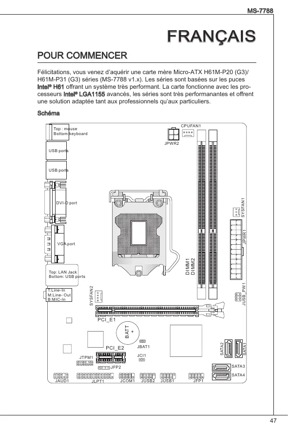 MS-7788 FrançaiS Pour coMMencer Félicitations, vous venez d’aquérir une carte mère Micro-ATX H61M-P20 (G3)/ H61M-P31 (G3) séries (MS-7788 v1.x). Les séries sont basées sur les puces Intel® H61 offrant un système très performant. La carte fonctionne avec les processeurs Intel® LGA1155 avancés, les séries sont très performanantes et offrent une solution adaptée tant aux professionnels qu’aux particuliers. Schéma CPUFAN1 Top : mouse Bottom:keyboard JPWR2 USB ports SYSFAN1 USB ports JPWR1 DVI-D port DIMM1 DIMM2 VGA port SYSFAN2 T:Line-In M:Line- Out B:MIC-In JUSB_PW1 Top: LAN Jack Bottom: USB ports JBAT1 JCI1 JTPM1 SATA3 JFP2 JAUD1 JLPT1 JCOM1 SATA1 PCI_E2 SATA2 BATT