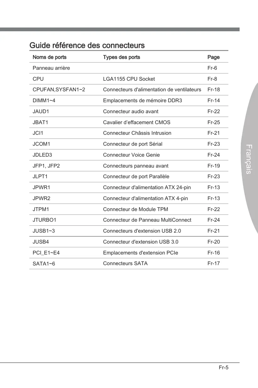 JUSB4 JBAT1 PCI_E1 JCI1 PCI_E2 SATA1/ 2 JCOM1 PCI_E3 SATA3/ 4 JTPM1 PCI_E4 SATA5/ 6 JFP1 JAUD1 JFP2 JLPT1 JUSB1/ 2/ 3 JDLED3 Fr-4 Guide référence des connecteurs Noms de ports Types des ports Page Fr-6 CPU LGA1155 CPU Socket Fr-8 CPUFAN,SYSFAN1~2 Connecteurs d'alimentation de ventilateurs Fr-18 DIMM1~4 Emplacements de mémoire DDR3 Fr-14 JAUD1 Connecteur audio avant Fr-22 JBAT1 Cavalier d’effacement CMOS Fr-25 JCI1 Connecteur Châssis Intrusion Fr-21 JCOM1 Connecteur de port Sérial Fr-23 JDLED3 Connecteur Voice Genie Fr-24 JFP1, JFP2 Connecteurs panneau avant Fr-19 JLPT1 Connecteur de port Parallèle Fr-23 JPWR1 Connecteur d'alimentation ATX 24-pin Fr-13 JPWR2 Connecteur d'alimentation ATX 4-pin Fr-13 JTPM1 Connecteur de Module TPM Fr-22 JTURBO1 Connecteur de Panneau MultiConnect Fr-24 JUSB1~3 Connecteurs d'extension USB 2.0 Fr-21 JUSB4 Connecteur d'extension USB 3.0 Fr-20