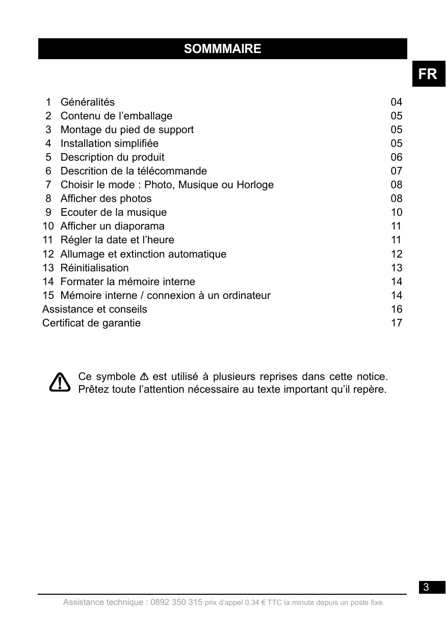 1 Généralités 2 Contenu de l’emballage 3 Montage du pied de support 4 Installation simplifiée 5 Description du produit 6 Descrition de la télécommande 7 Choisir le mode : Photo, Musique ou Horloge 8 Afficher des photos 9 Ecouter de la musique 10 Afficher un diaporama 11 Régler la date et l’heure 12 Allumage et extinction automatique 13 Réinitialisation 14 Formater la mémoire interne 15 Mémoire interne / connexion à un ordinateur Assistance et conseils Certificat de garantie