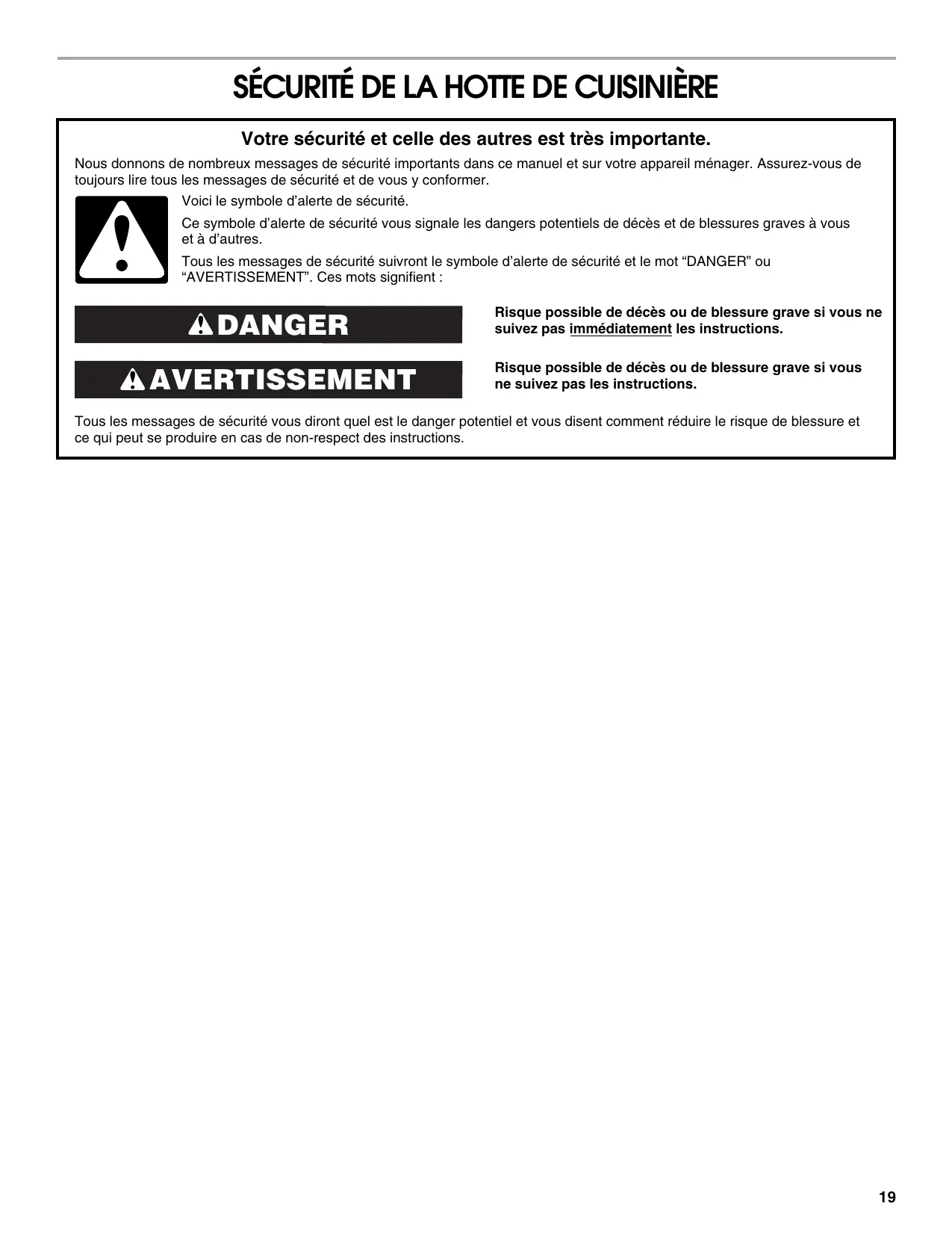 Nous donnons de nombreux messages de sécurité importants dans ce manuel et sur votre apparil menager. Assurez-vous de plusieurs jours dire tous les messages de sécurité et de vous y conformer.
