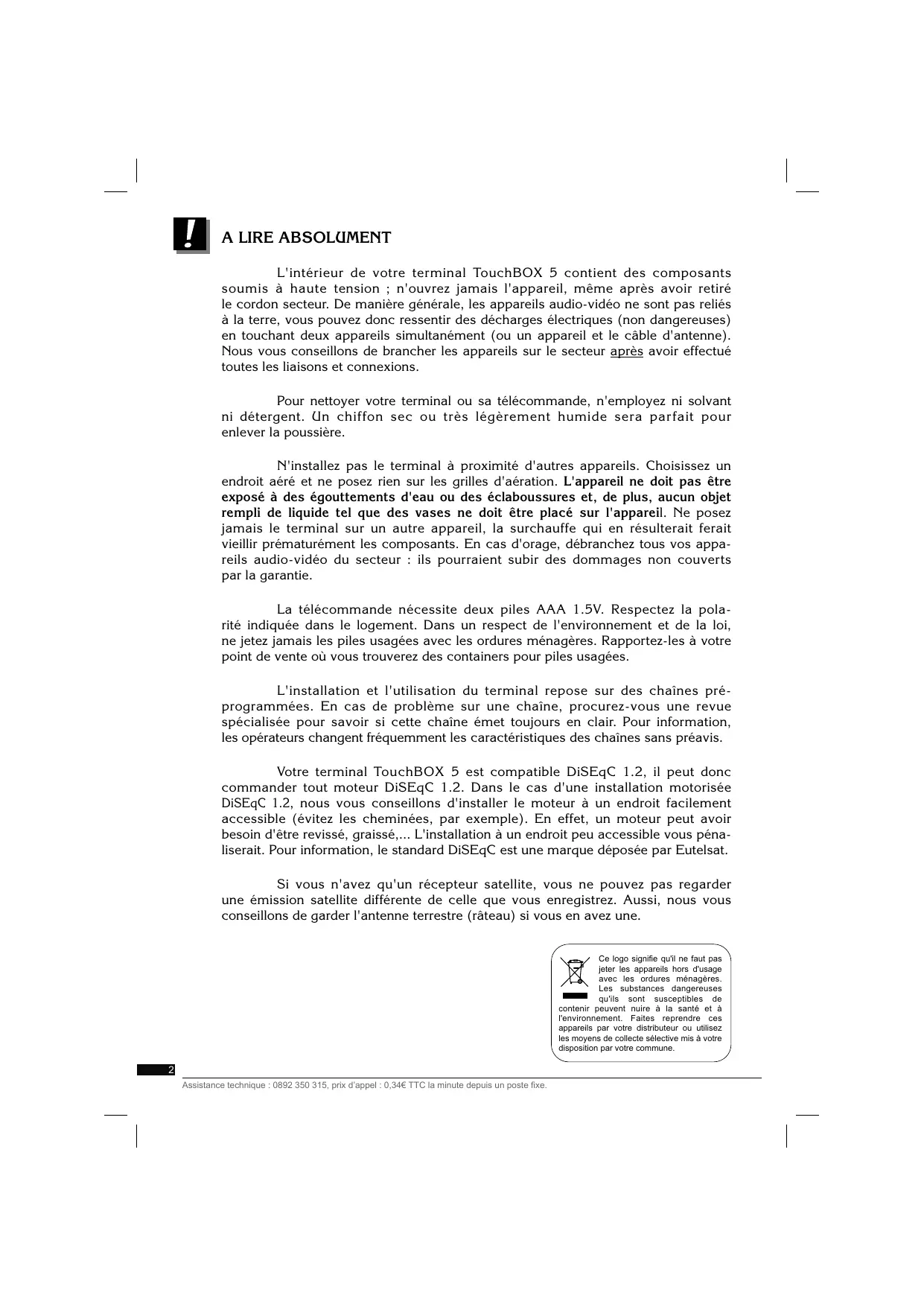 L'intérieur de votre terminal TouchBOX 5 contient des composants soumis à haute tension ; n'ouvrez jamais l'appareil, même après avoir retiré le cordon secteur. De manière générale, les appareils audio-vidéo ne sont pas reliés à la terre, vous pouvez donc ressentir des décharges électriques (non dangereuses) en touchant deux appareils simultanément (ou un appareil et le câble d'antenne). Nous vous conseillons de brancher les appareils sur le secteur après avoir effectué toutes les liaisons et connexions. Pour nettoyer votre terminal ou sa télécommande, n'employez ni solvant ni détergent. Un chiffon sec ou très légèrement humide sera par fait pour enlever la poussière. N'installez pas le terminal à proximité d'autres appareils. Choisissez un endroit aéré et ne posez rien sur les grilles d'aération. L'appareil ne doit pas être exposé à des égouttements d'eau ou des éclaboussures et, de plus, aucun objet rempli de liquide tel que des vases ne doit être placé sur l'appareil. Ne posez jamais le terminal sur un autre appareil, la surchauffe qui en résulterait ferait vieillir prématurément les composants. En cas d'orage, débranchez tous vos appareils audio-vidéo du secteur : ils pourraient subir des dommages non couverts par la garantie. La télécommande nécessite deux piles AAA 1.5V. Respectez la polarité indiquée dans le logement. Dans un respect de l'environnement et de la loi, ne jetez jamais les piles usagées avec les ordures ménagères. Rapportez-les à votre point de vente où vous trouverez des containers pour piles usagées. L'installation et l'utilisation du terminal repose sur des chaînes préprogrammées. En cas de problème sur une chaîne, procurez-vous une revue spécialisée pour savoir si cette chaîne émet toujours en clair. Pour information, les opérateurs changent fréquemment les caractéristiques des chaînes sans préavis. Votre terminal TouchBOX 5 est compatible DiSEqC 1.2, il peut donc commander tout moteur DiSEqC 1.2. Dans le cas d'une installation motorisée DiSEqC 1.2, nous vous conseillons d'installer le moteur à un endroit facilement accessible (évitez les cheminées, par exemple). En effet, un moteur peut avoir besoin d'être revissé, graissé,... L'installation à un endroit peu accessible vous pénaliserait. Pour information, le standard DiSEqC est une marque déposée par Eutelsat. Si vous n'avez qu'un récepteur satellite, vous ne pouvez pas regarder une émission satellite différente de celle que vous enregistrez. Aussi, nous vous conseillons de garder l'antenne terrestre (râteau) si vous en avez une. Ce logo signifie qu'il ne faut pas jeter les appareils hors d'usage avec les ordures ménagères. Les substances dangereuses qu'ils sont susceptibles de contenir peuvent nuire à la santé et à l'environnement. Faites reprendre ces appareils par votre distributeur ou utilisez les moyens de collecte sélective mis à votre disposition par votre commune.