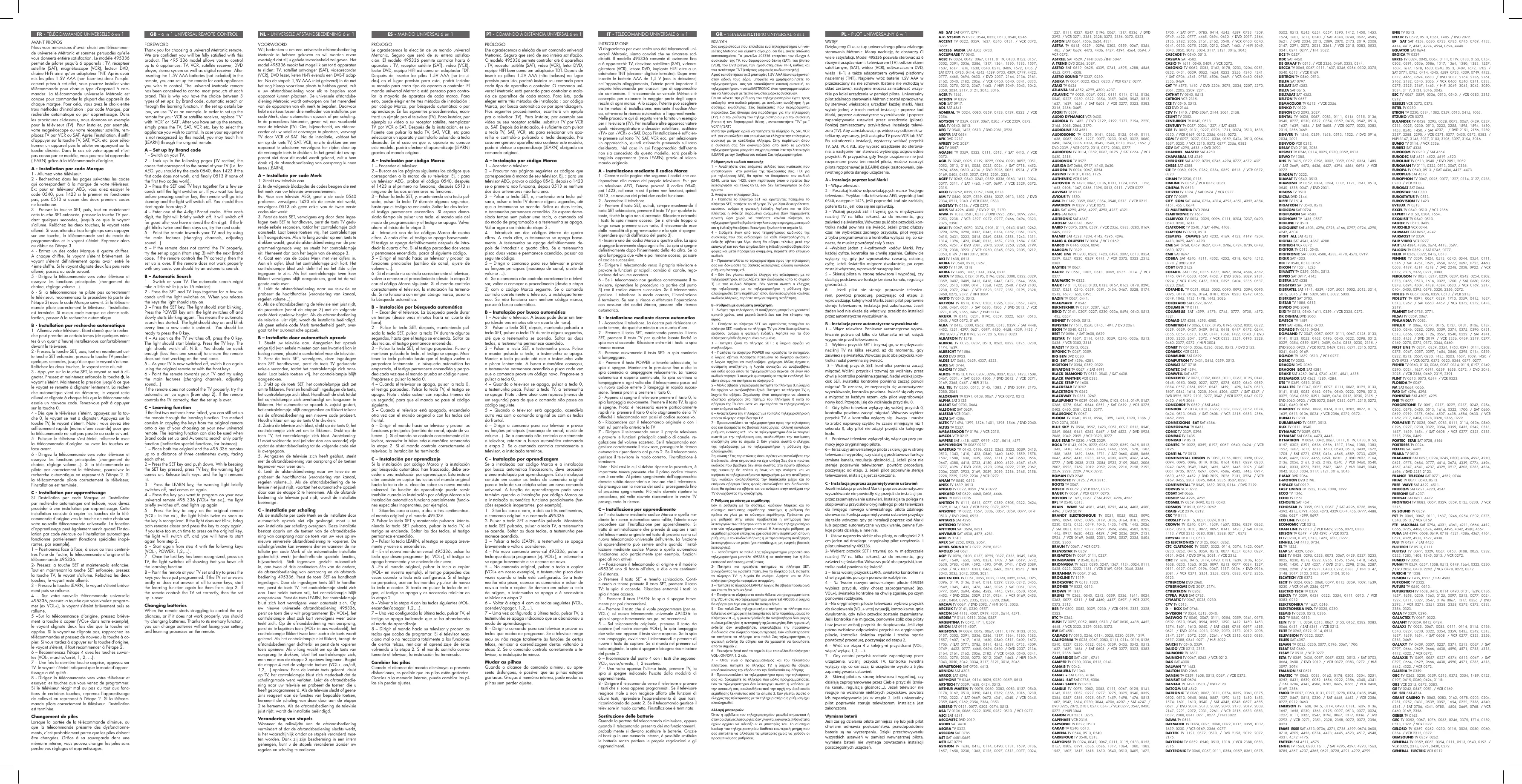 AVANT PROPOS Nous vous remercions d’avoir choisi une télécommande universelle Métronic et sommes persuadés qu’elle vous donnera entière satisfaction. Le modèle 495336 permet de piloter jusqu’à 6 appareils : TV, récepteur satellite (SAT), magnétoscope (VCR), lecteur DVD, chaîne Hi-Fi ainsi qu’un adaptateur TNT. Après avoir mis les piles 1.5V AAA (non fournies) dans l’emplacement prévu à cet effet, vous pourrez installer votre télécommande pour chaque type d’appareil à commander. La télécommande universelle Métronic est conçue pour commander la plupart des appareils de chaque marque. Pour cela, vous avez le choix entre trois méthodes d’installation : par code Marque, par recherche automatique ou par apprentissage. Dans les procédures ci-dessous, nous donnons un exemple pour le téléviseur (TV). Pour installer, par exemple, votre magnétoscope ou votre récepteur satellite, remplacez TV par VCR ou SAT. Après l’installation, il suffit d’appuyer sur la touche TV, SAT, VCR, etc. pour sélectionner un appareil puis le piloter en appuyant sur la touche désirée. Dans le cas où votre appareil n’est pas connu par ce modèle, vous pourrez lui apprendre (LEARN) grâce à la télécommande d’origine. A - Installation par code Marque 1 - Allumez votre téléviseur. 2 - Recherchez dans les pages suivantes les codes qui correspondent à la marque de votre téléviseur. Ex: pour un téléviseur AEG, vous allez essayer le code 0540, puis 1423 si le premier ne fonctionne pas, puis 0513 si aucun des deux premiers codes ne fonctionne. 3 - Pressez la touche SET, puis, tout en maintenant cette touche SET enfoncée, pressez la touche TV pendant quelques secondes, jusqu’à ce que le voyant s’allume. Relâchez les deux touches, le voyant reste allumé. Si vous attendez trop longtemps sans appuyer sur une touche, la télécommande sort du mode de programmation et le voyant s’éteint. Reprenez alors au début de l’étape 3. 4 - Entrez un des codes Marque à quatre chiffres. A chaque chiffre, le voyant s’éteint brièvement. Le voyant s’éteint définitivement après avoir entré le 4ème chiffre. Si le voyant clignote deux fois puis reste allumé, passez au code suivant. 5 - Dirigez la télécommande vers votre téléviseur et essayez les fonctions principales (changement de chaîne, réglage volume...). 6 - Si la télécommande ne pilote pas correctement le téléviseur, recommencez la procédure (à partir de l’étape 3) avec le code Marque suivant. Si la télécommande pilote correctement le téléviseur, l’installation est terminée. Si aucun code marque ne donne satisfaction, passez à la recherche automatique. B - Installation par recherche automatique 1 - Allumez votre téléviseur. Étant donné que la recherche peut prendre un certain temps (de quelques minutes à un quart d’heure) installez-vous confortablement devant le téléviseur. 2 - Pressez la touche SET, puis, tout en maintenant cette touche SET enfoncée, pressez la touche TV pendant quelques secondes, jusqu’à ce que le voyant s’allume. Relâchez les deux touches, le voyant reste allumé. 3 - Appuyez sur la touche SET, le voyant se met à clignoter. Pressez et maintenez enfoncée la touche , le voyant s’éteint. Maintenez la pression jusqu’à ce que le voyant se remette à clignoter lentement. La recherche automatique vient de démarrer, le voyant reste allumé et clignote à chaque fois que la télécommande essaie un nouveau code. Tenez-vous prêt à appuyer sur la touche 0. 4 - Dès que le téléviseur s’éteint, appuyez sur la touche 0, le voyant se met à clignoter. Appuyez sur la touche TV, le voyant s’éteint. Note : vous devez être suffisamment rapide (moins d’une seconde) pour que la télécommande ne soit pas passée au code suivant. 5 - Puisque le téléviseur s’est éteint, rallumez-le avec la télécommande d’origine ou avec les touches en face avant. 6 - Dirigez la télécommande vers votre téléviseur et essayez les fonctions principales (changement de chaîne, réglage volume...). Si la télécommande ne pilote pas correctement le téléviseur, poursuivez la recherche automatique en reprenant à l’étape 2. Si la télécommande pilote correctement le téléviseur, l’installation est terminée. C - Installation par apprentissage Si l’installation par code Marque et l’installation par recherche automatique ont échoué, vous devez procéder à une installation par apprentissage. Cette installation consiste à copier les touches de la télécommande d’origine vers la touche de votre choix sur votre nouvelle télécommande universelle. La fonction d’apprentissage peut également servir quand l’installation par code Marque ou l’installation automatique fonctionne partiellement (fonctions spéciales inopérantes, par exemple). 1 – Positionnez face à face, à deux ou trois centimètres l’une de l’autre, la télécommande d’origine et la télécommande 495336. 2- Pressez la touche SET et maintenez-la enfoncée. Tout en maintenant la touche SET enfoncée, pressez la touche TV, le voyant s’allume. Relâchez les deux touches, le voyant reste allumé. 3 – Pressez la touche LEARN, le voyant s’éteint brièvement puis se rallume. 4 – Sur votre nouvelle télécommande universelle 495336, pressez la touche que vous voulez programmer (ex VOL+), le voyant s’éteint brièvement puis se rallume. 5 –Sur la télécommande d’origine, pressez brièvement la touche à copier (VOL+ dans notre exemple), le voyant clignote deux fois dès que la touche est apprise. Si le voyant ne clignote pas, rapprochez les télécommandes et pressez de nouveau la touche à copier. Si vous tardez à appuyer sur la touche d’origine, le voyant s’éteint, il faut recommencer à l’étape 2. 6 – Recommencez l’étape 4 avec les touches suivantes (VOL-, marche/arrêt, 1, 2, …). 7 – Une fois la dernière touche apprise, appuyez sur TV, le voyant
