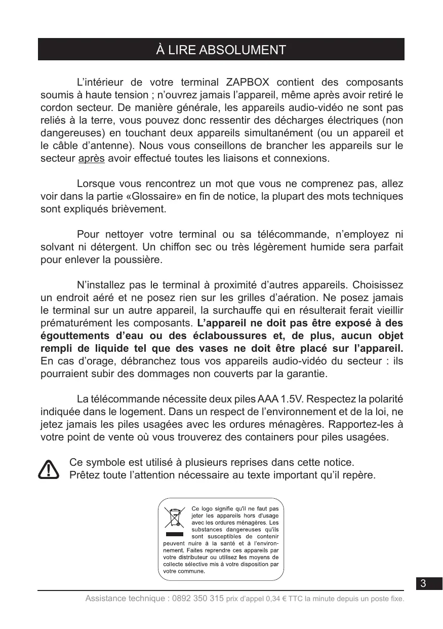 À LIRE ABSOLUMENT L’intérieur de votre terminal ZAPBOX contient des composants soumis à haute tension ; n’ouvrez jamais l’appareil, même après avoir retiré le cordon secteur. De manière générale, les appareils audio-vidéo ne sont pas reliés à la terre, vous pouvez donc ressentir des décharges électriques (non dangereuses) en touchant deux appareils simultanément (ou un appareil et le câble d’antenne). Nous vous conseillons de brancher les appareils sur le secteur après avoir effectué toutes les liaisons et connexions. Lorsque vous rencontrez un mot que vous ne comprenez pas, allez voir dans la partie «Glossaire» en fin de notice, la plupart des mots techniques sont expliqués brièvement. Pour nettoyer votre terminal ou sa télécommande, n’employez ni solvant ni détergent. Un chiffon sec ou très légèrement humide sera parfait pour enlever la poussière. N’installez pas le terminal à proximité d’autres appareils. Choisissez un endroit aéré et ne posez rien sur les grilles d’aération. Ne posez jamais le terminal sur un autre appareil, la surchauffe qui en résulterait ferait vieillir prématurément les composants. L’appareil ne doit pas être exposé à des égouttements d’eau ou des éclaboussures et, de plus, aucun objet rempli de liquide tel que des vases ne doit être placé sur l’appareil. En cas d’orage, débranchez tous vos appareils audio-vidéo du secteur : ils pourraient subir des dommages non couverts par la garantie. La télécommande nécessite deux piles AAA 1.5V. Respectez la polarité indiquée dans le logement. Dans un respect de l’environnement et de la loi, ne jetez jamais les piles usagées avec les ordures ménagères. Rapportez-les à votre point de vente où vous trouverez des containers pour piles usagées. Ce symbole est utilisé à plusieurs reprises dans cette notice. Prêtez toute l’attention nécessaire au texte important qu’il repère.