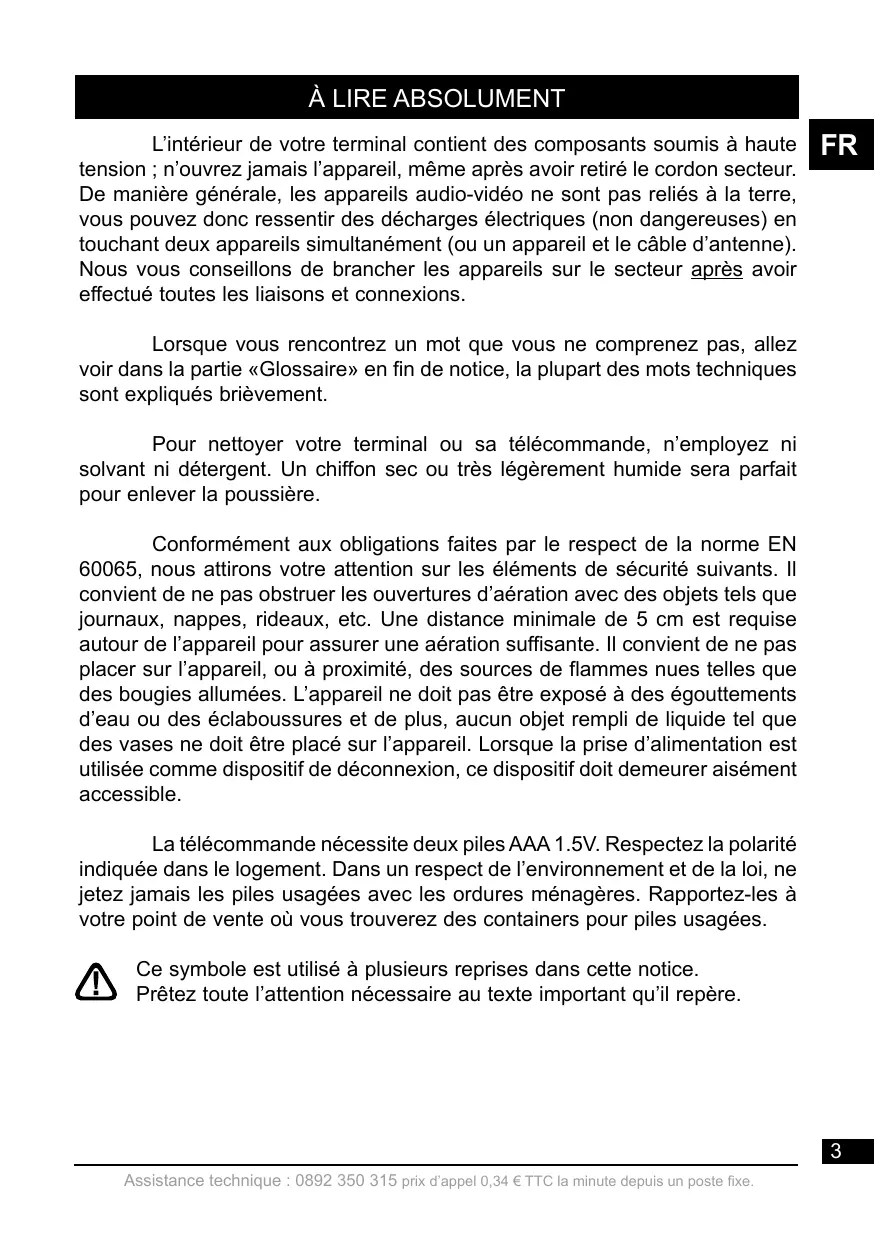 Lorsque vous rencontrez un mot que vous ne comprenez pas, allez voir dans la partie «Glossaire» en fin de notice, la plupart des mots techniques sont expliqués brièvement. Pour nettoyer votre terminal ou sa télécommande, n’employez ni solvant ni détergent. Un chiffon sec ou très légèrement humide sera parfait pour enlever la poussière. Conformément aux obligations faites par le respect de la norme EN 60065, nous attirons votre attention sur les éléments de sécurité suivants. Il convient de ne pas obstruer les ouvertures d’aération avec des objets tels que journaux, nappes, rideaux, etc. Une distance minimale de 5 cm est requise autour de l’appareil pour assurer une aération suffisante. Il convient de ne pas placer sur l’appareil, ou à proximité, des sources de flammes nues telles que des bougies allumées. L’appareil ne doit pas être exposé à des égouttements d’eau ou des éclaboussures et de plus, aucun objet rempli de liquide tel que des vases ne doit être placé sur l’appareil. Lorsque la prise d’alimentation est utilisée comme dispositif de déconnexion, ce dispositif doit demeurer aisément accessible. La télécommande nécessite deux piles AAA 1.5V. Respectez la polarité indiquée dans le logement. Dans un respect de l’environnement et de la loi, ne jetez jamais les piles usagées avec les ordures ménagères. Rapportez-les à votre point de vente où vous trouverez des containers pour piles usagées. Ce symbole est utilisé à plusieurs reprises dans cette notice. Prêtez toute l’attention nécessaire au texte important qu’il repère.