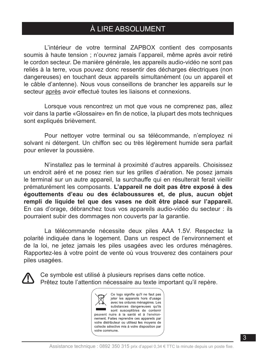 À LIRE ABSOLUMENT L’intérieur de votre terminal ZAPBOX contient des composants soumis à haute tension ; n’ouvrez jamais l’appareil, même après avoir retiré le cordon secteur. De manière générale, les appareils audio-vidéo ne sont pas reliés à la terre, vous pouvez donc ressentir des décharges électriques (non dangereuses) en touchant deux appareils simultanément (ou un appareil et le câble d’antenne). Nous vous conseillons de brancher les appareils sur le secteur après avoir effectué toutes les liaisons et connexions. Lorsque vous rencontrez un mot que vous ne comprenez pas, allez voir dans la partie «Glossaire» en fin de notice, la plupart des mots techniques sont expliqués brièvement. Pour nettoyer votre terminal ou sa télécommande, n’employez ni solvant ni détergent. Un chiffon sec ou très légèrement humide sera parfait pour enlever la poussière. N’installez pas le terminal à proximité d’autres appareils. Choisissez un endroit aéré et ne posez rien sur les grilles d’aération. Ne posez jamais le terminal sur un autre appareil, la surchauffe qui en résulterait ferait vieillir prématurément les composants. L’appareil ne doit pas être exposé à des égouttements d’eau ou des éclaboussures et, de plus, aucun objet rempli de liquide tel que des vases ne doit être placé sur l’appareil. En cas d’orage, débranchez tous vos appareils audio-vidéo du secteur : ils pourraient subir des dommages non couverts par la garantie. La télécommande nécessite deux piles AAA 1.5V. Respectez la polarité indiquée dans le logement. Dans un respect de l’environnement et de la loi, ne jetez jamais les piles usagées avec les ordures ménagères. Rapportez-les à votre point de vente où vous trouverez des containers pour piles usagées. Ce symbole est utilisé à plusieurs reprises dans cette notice. Prêtez toute l’attention nécessaire au texte important qu’il repère.