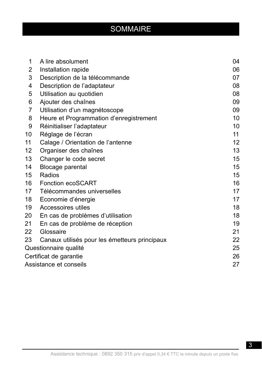 L’intérieur de votre terminal contient des composants soumis à haute tension ; n’ouvrez jamais l’appareil, même après avoir retiré le cordon secteur. De manière générale, les appareils audio-vidéo ne sont pas reliés à la terre, vous pouvez donc ressentir des décharges électriques (non dangereuses) en touchant deux appareils simultanément (ou un appareil et le câble d’antenne). Nous vous conseillons de brancher les appareils sur le secteur après avoir effectué toutes les liaisons et connexions. Lorsque vous rencontrez un mot que vous ne comprenez pas, allez voir dans la partie «Glossaire» de la section avancée, la plupart des mots techniques y sont expliqués. Pour nettoyer votre terminal ou sa télécommande, n’employez ni solvant ni détergent. Un chiffon sec ou très légèrement humide sera parfait pour enlever la poussière. N’installez pas le terminal à proximité d’autres appareils. Choisissez un endroit aéré et ne posez rien sur les grilles d’aération. Ne posez jamais le terminal sur un autre appareil, la surchauffe qui en résulterait ferait vieillir prématurément les composants. En cas d’orage, débranchez tous vos appareils audio-vidéo du secteur : ils pourraient subir des dommages non couverts par la garantie. Conformément aux obligations faites par le respect de la norme EN 60065, nous attirons votre attention sur les éléments de sécurité suivants. Il convient de ne pas obstruer les ouvertures d’aération avec des objets tels que journaux, nappes, rideaux, etc. Une distance minimale de 5 cm est requise autour de l’appareil pour assurer une aération suffisante. Il convient de ne pas placer sur l’appareil, ou à proximité, des sources de flammes nues telles que des bougies allumées. L’appareil ne doit pas être exposé à des égouttements d’eau ou des éclaboussures et de plus, aucun objet rempli de liquide tel que des vases ne doit être placé sur l’appareil. Lorsque la prise d’alimentation est utilisée comme dispositif de déconnexion, ce dispositif doit demeurer aisément accessible. La télécommande nécessite deux piles AAA 1.5V. Respectez la polarité indiquée dans le logement. Dans un respect de l’environnement et de la loi, ne jetez jamais les piles usagées avec les ordures ménagères. Rapportez-les à votre point de vente où vous trouverez des containers pour piles usagées. Le bon fonctionnement de l’appareil sous-entend une utilisation conforme à cette notice. Aucune fonction présente dans l’appareil, mais non décrite dans cette notice ne présente de garantie. Aussi, certaines fonctions considérées Assistance technique : 0892 350 315 prix d’appel 0,34 € TTC la minute depuis un poste fixe. UCHE
