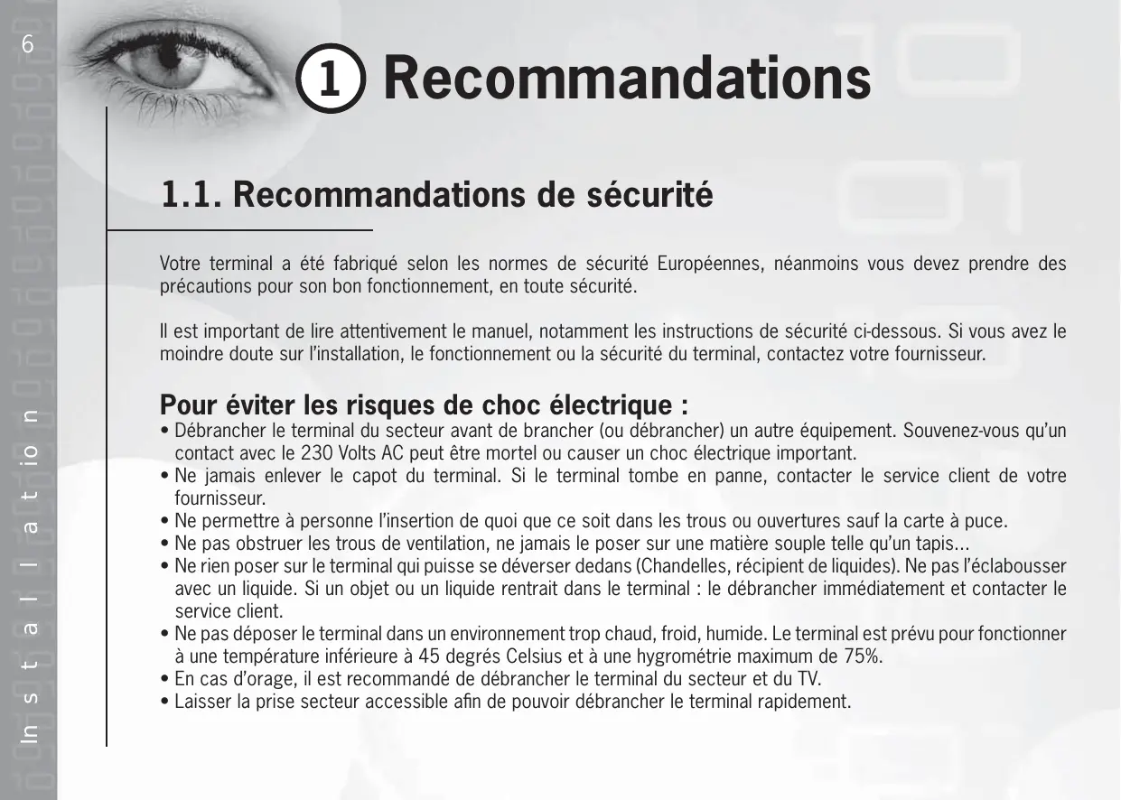 - INSTALLATION 1 Recommandations Recommandations de sécurité p. 6