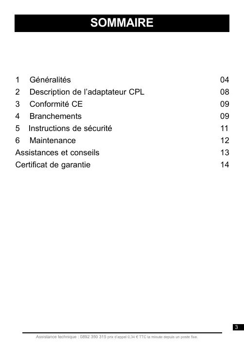 SOMMAIRI 1 Généralités 04 2 Description de l'adaptateur CPL 08 3 Conformité CE 09 4 Branchements 09 5 Instructions de sécurité 11 6 Maintenance 12 Assistances et conseils 13 Certificat de garantie 14