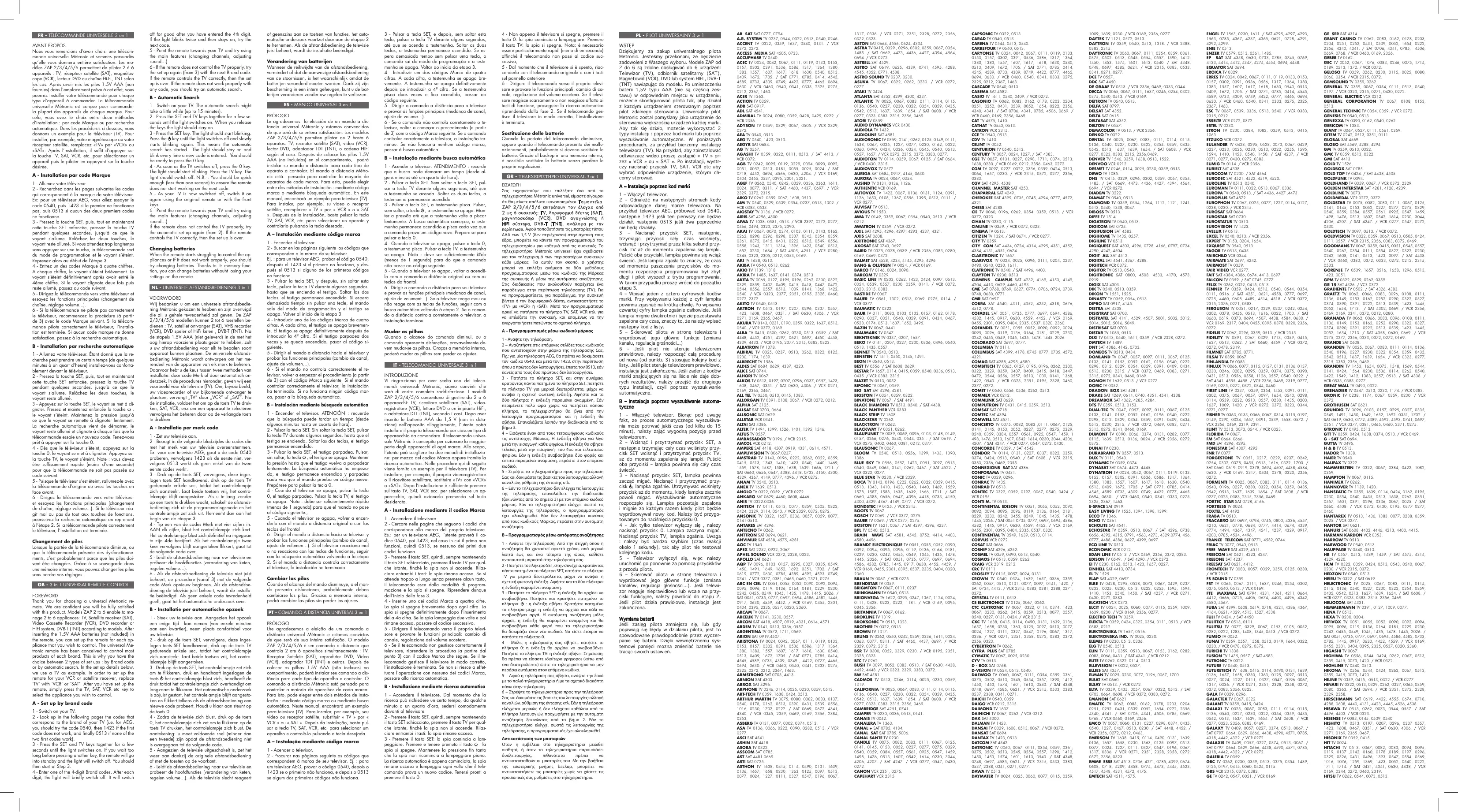 et essayez les fonctions principales (changement de chaîne, réglage volume...). Si le téléviseur réagit mal ou pas du tout aux touches de fonctions, poursuivez la recherche automatique en reprenant à l’étape 2. Si la télécommande pilote correctement le téléviseur, l’installation est terminée. Changement de piles Lorsque la portée de la télécommande diminue, ou que la télécommande présente des dysfonctionnements, c’est probablement parce que les piles doivent être changées. Grâce à sa sauvegarde dans une mémoire interne, vous pouvez changer les piles sans perdre vos réglages. GB - 3 in 1 UNIVERSAL REMOTE CONTROL FOREWORD Thank you for choosing a universal Metronic remote. We are confident you will be fully satisfied with this product. Models ZAP 2 to 6 enable to manage 2 to 6 appliances: TV, Satellite receiver (SAT), Video Cassette Recorder (VCR), DVD recorder or HIFI system, DVB-T (TNT) according to models. After inserting the 1.5V AAA batteries (not included) in the remote, you can set up the remote for each appliance that you wish to control. The universal Metronic remote has been conceived to control most products of each brand. This is why you have the choice between 2 types of set ups : by Brand code or by automatic search. In the set up details below, we use a TV as example. In order to set up the remote for your VCR or satellite receiver, replace ‘TV’ with ‘VCR’ or ‘SAT’. After you have set up the remote, simply press the TV, SAT, VCR etc key to select the appliance you wish to control. A - Set up by brand code