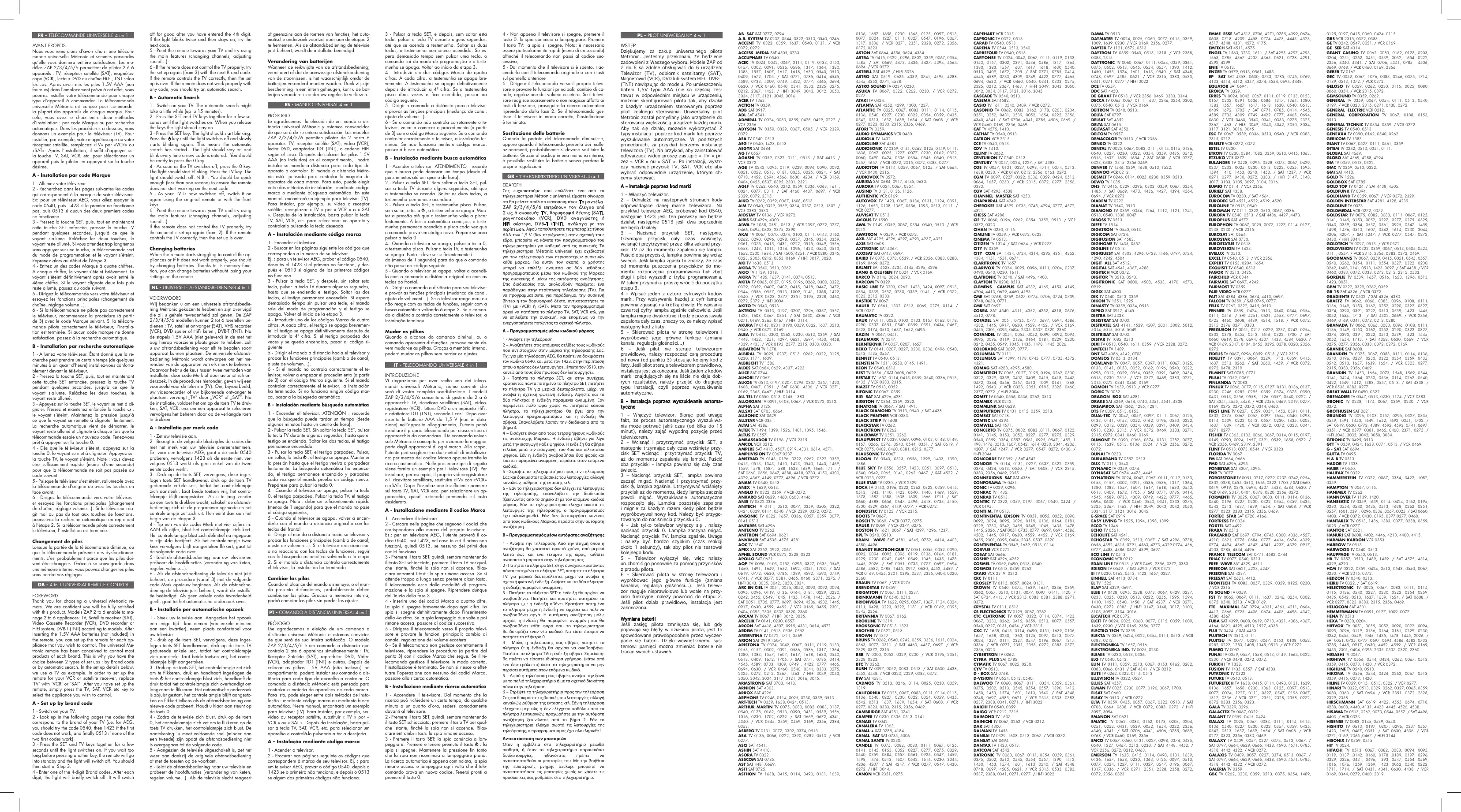 et essayez les fonctions principales (changement de chaîne, réglage volume...). Si le téléviseur réagit mal ou pas du tout aux touches de fonctions, poursuivez la recherche automatique en reprenant à l’étape 2. Si la télécommande pilote correctement le téléviseur, l’installation est terminée. Changement de piles Lorsque la portée de la télécommande diminue, ou que la télécommande présente des dysfonctionnements, c’est probablement parce que les piles doivent être changées. Grâce à sa sauvegarde dans une mémoire interne, vous pouvez changer les piles sans perdre vos réglages. GB - 4 in 1 UNIVERSAL REMOTE CONTROL FOREWORD Thank you for choosing a universal Metronic remote. We are confident you will be fully satisfied with this product. Models ZAP 2 to 6 enable to manage 2 to 6 appliances: TV, Satellite receiver (SAT), Video Cassette Recorder (VCR), DVD recorder or HIFI system, DVB-T (TNT) according to models. After inserting the 1.5V AAA batteries (not included) in the remote, you can set up the remote for each appliance that you wish to control. The universal Metronic remote has been conceived to control most products of each brand. This is why you have the choice between 2 types of set ups : by Brand code or by automatic search. In the set up details below, we use a TV as example. In order to set up the remote for your VCR or satellite receiver, replace ‘TV’ with ‘VCR’ or ‘SAT’. After you have set up the remote, simply press the TV, SAT, VCR etc key to select the appliance you wish to control. A - Set up by brand code