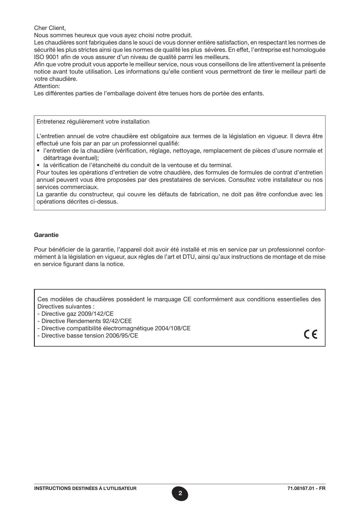 Afin que votre produit vous apporte le meilleur service, nous vous conseillons de dire attentivement la presente notice avant toute utilisation. Les informations qu'elle contient vous permettront de tirer le meilleur parti de votre chaudière.
